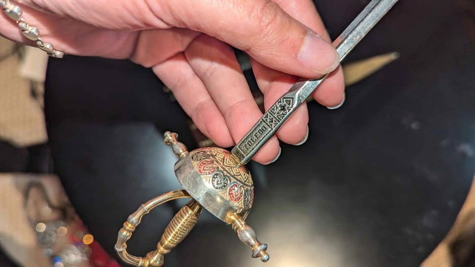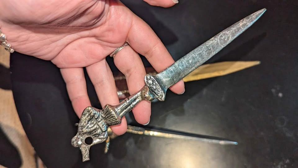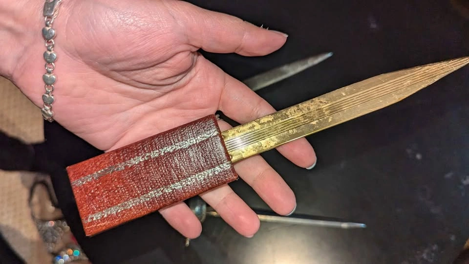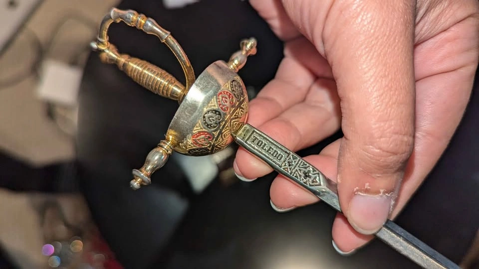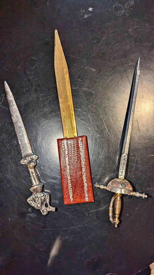 Unique set of 3 vintage mini swords / letter openers, great for collectors, display, or functional desk use. Each piece has its own character and craftsmanship. Spanish Toledo Sword – Marked “TOLEDO”, intricate guard with red/black enamel, ornate detailing, classic collectible piece from Spain. Gold-Toned Sword with Sheath – Decorative etched blade with vintage red sheath. Silver Mini Sword – Cast metal with knight/dragon-style hilt design, solid vintage look. Each approx. 6–8" in length (miniature display/desk size). Good vintage condition, with some natural patina and wear from age (adds to the look). 20 for the set , not individual Burlington
