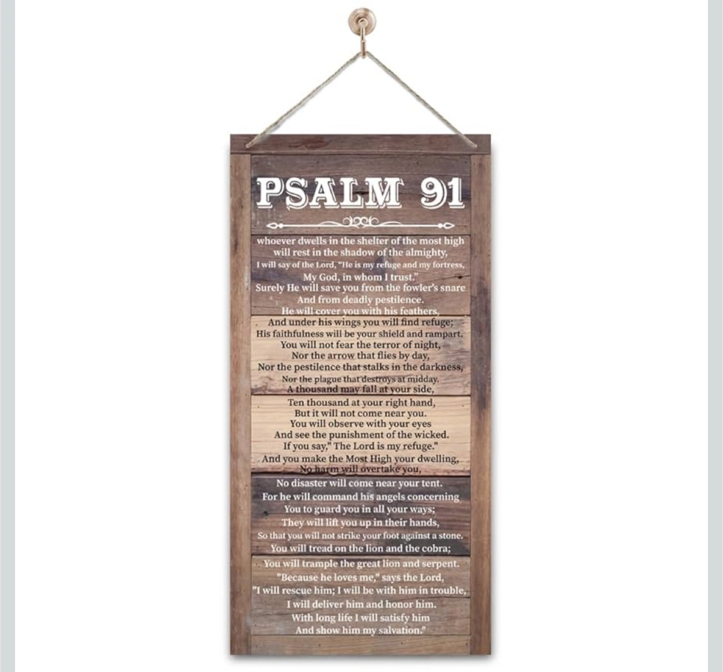 Add a touch of faith to your home with this Psalm 91 wooden wall decor! It's made of quality solid wood composite board and features a high-quality graphic colour printed front. The wood sign decor has jute twine for easy wall door hanging. Dimensions are 13.8 inch x 6.9 inch. Practical, eye-catching, sturdy and odor-free!