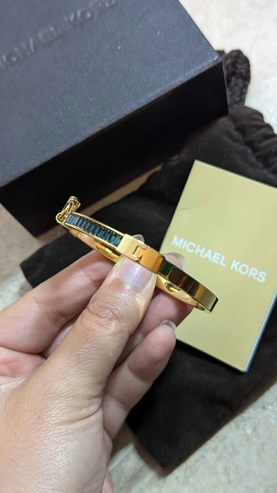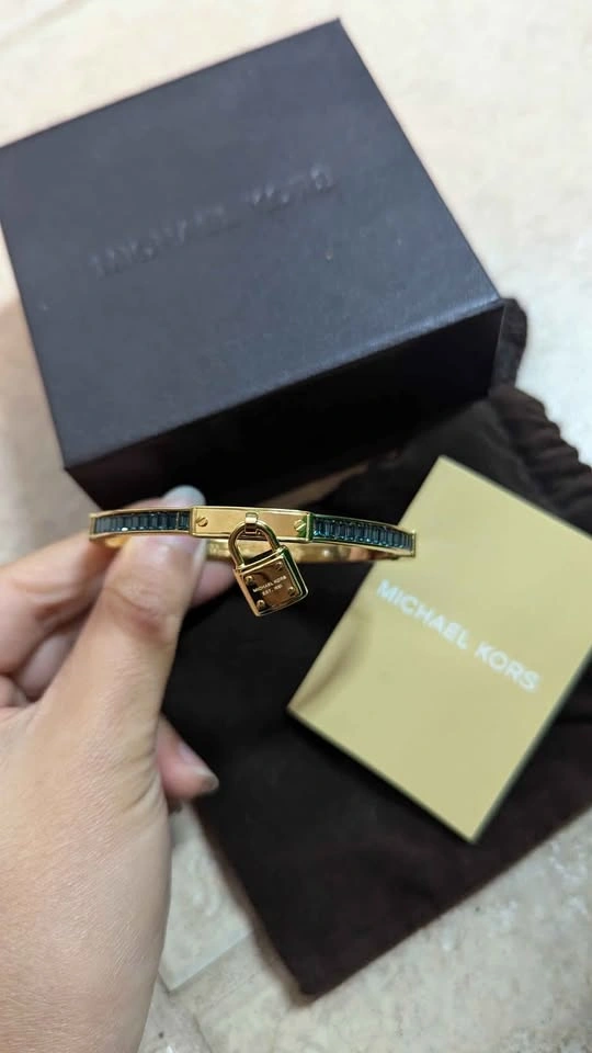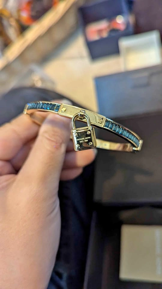Gold-tone finish with rectangular blue crystal inlay Authentic item, Signature Michael Kors padlock charm (engraved “Michael Kors Est. 1981”) Hinged closure for easy wear Elegant and timeless statement piece Comes with original box and dust bag and booklet - never worn