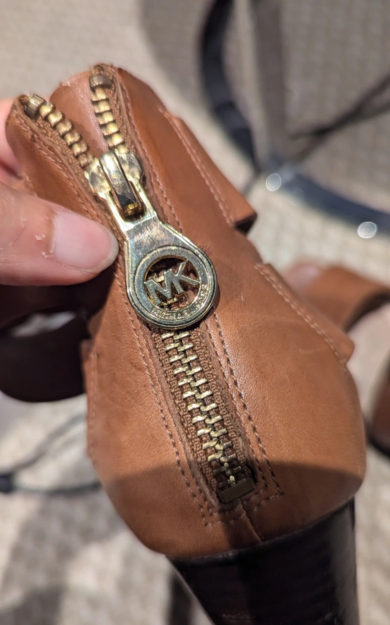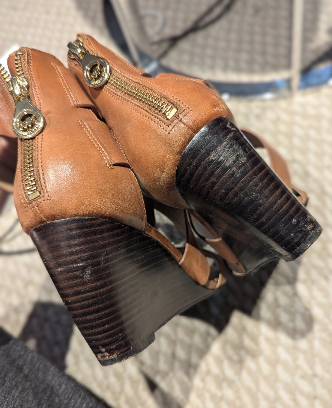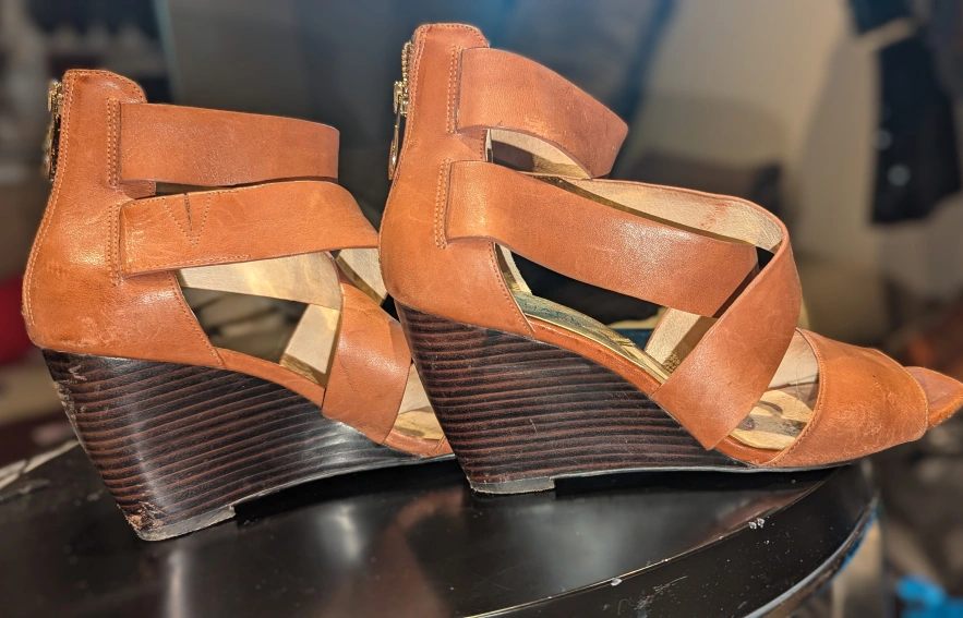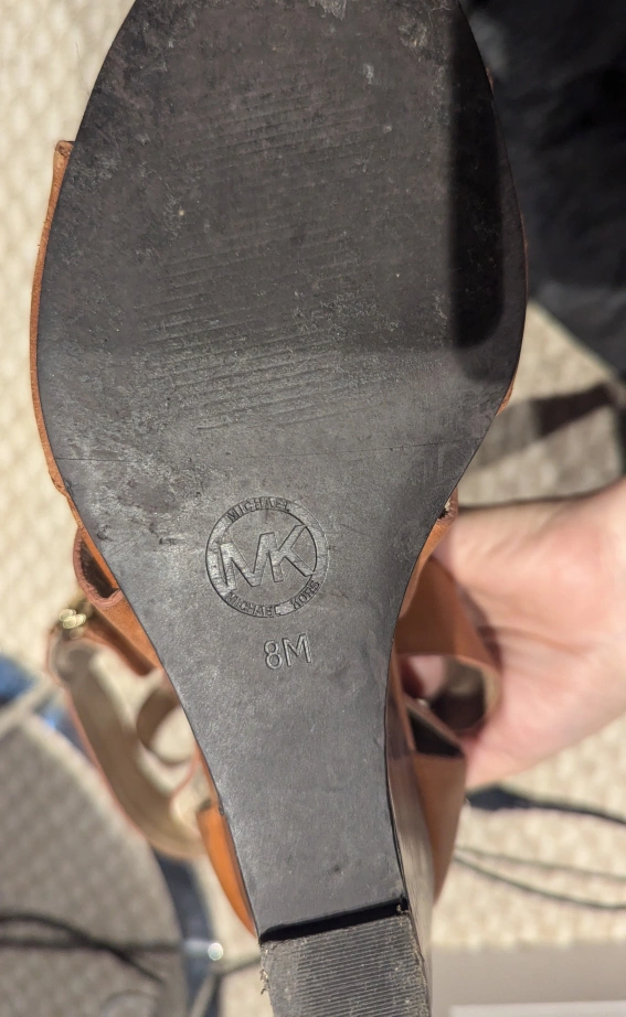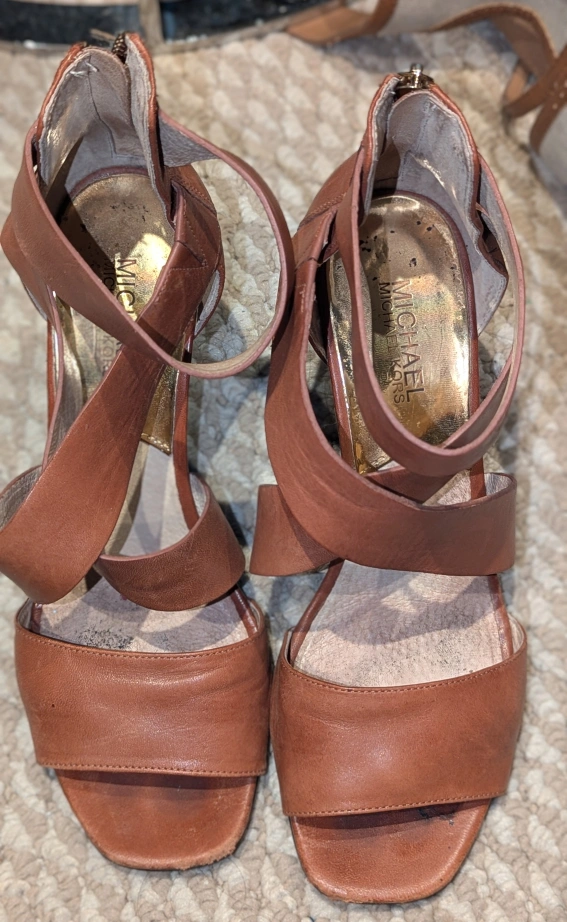 Selling a pair of Michael Kors wedge sandals in a stylish brown leather! They're a size 8M and feature a unique wraparound design with a zipper at the back. The wedge heel is a dark wood colour. These have some wear and tear. please see photos for condition, used.
