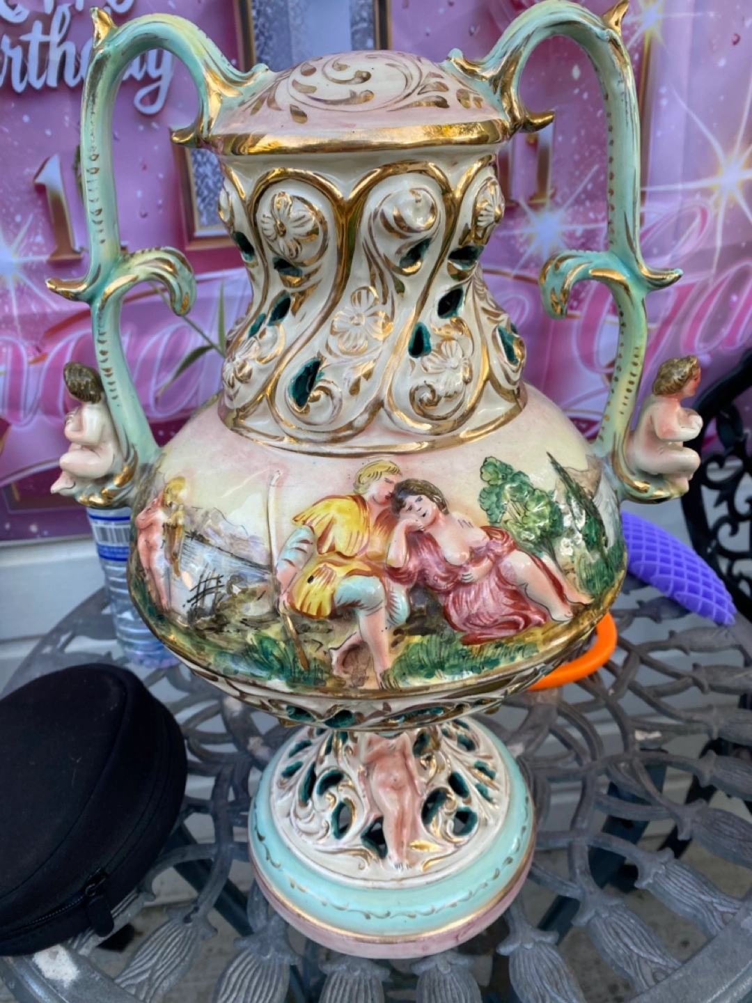 Selling a unique vintage vase with decorative handles and a detailed design. It features a classical scene with figures and ornate gold accents. A beautiful piece for any collection!