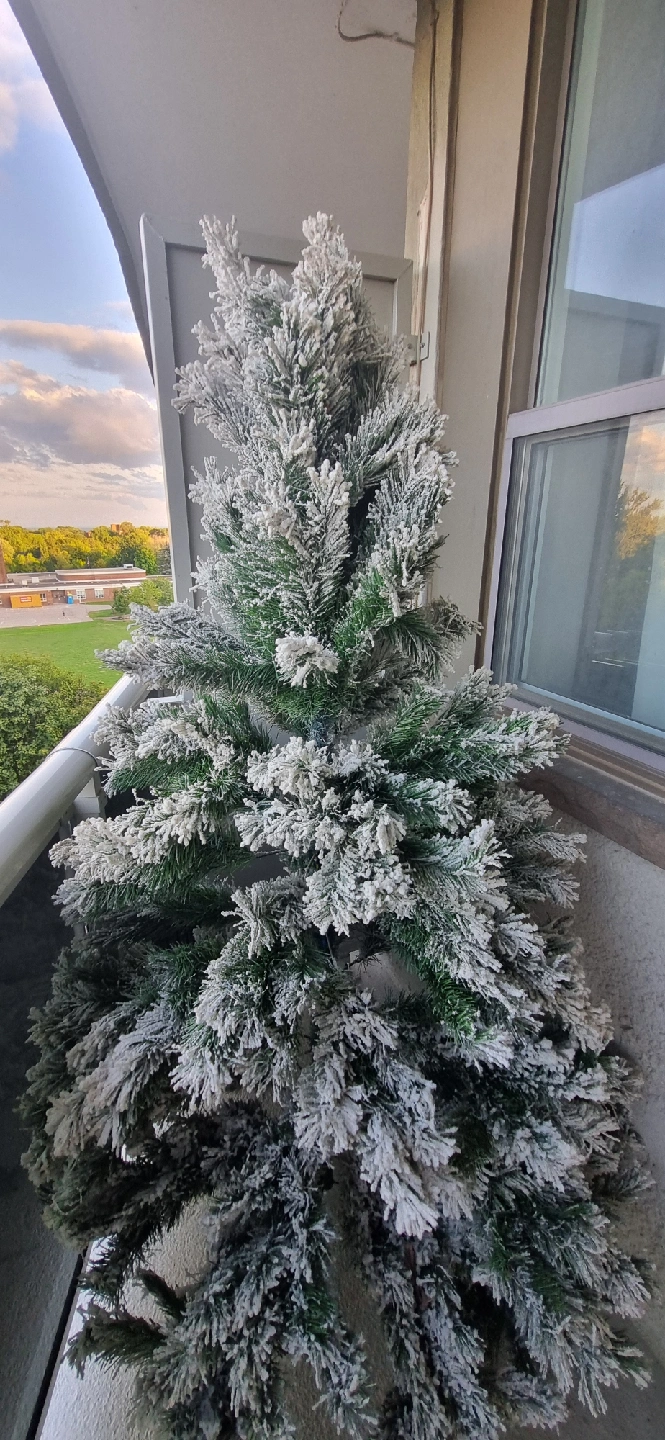 Selling a Christmas tree, flocked with artificial snow. Perfect for apartments or small spaces. It's in great condition and ready to bring some holiday cheer to your home