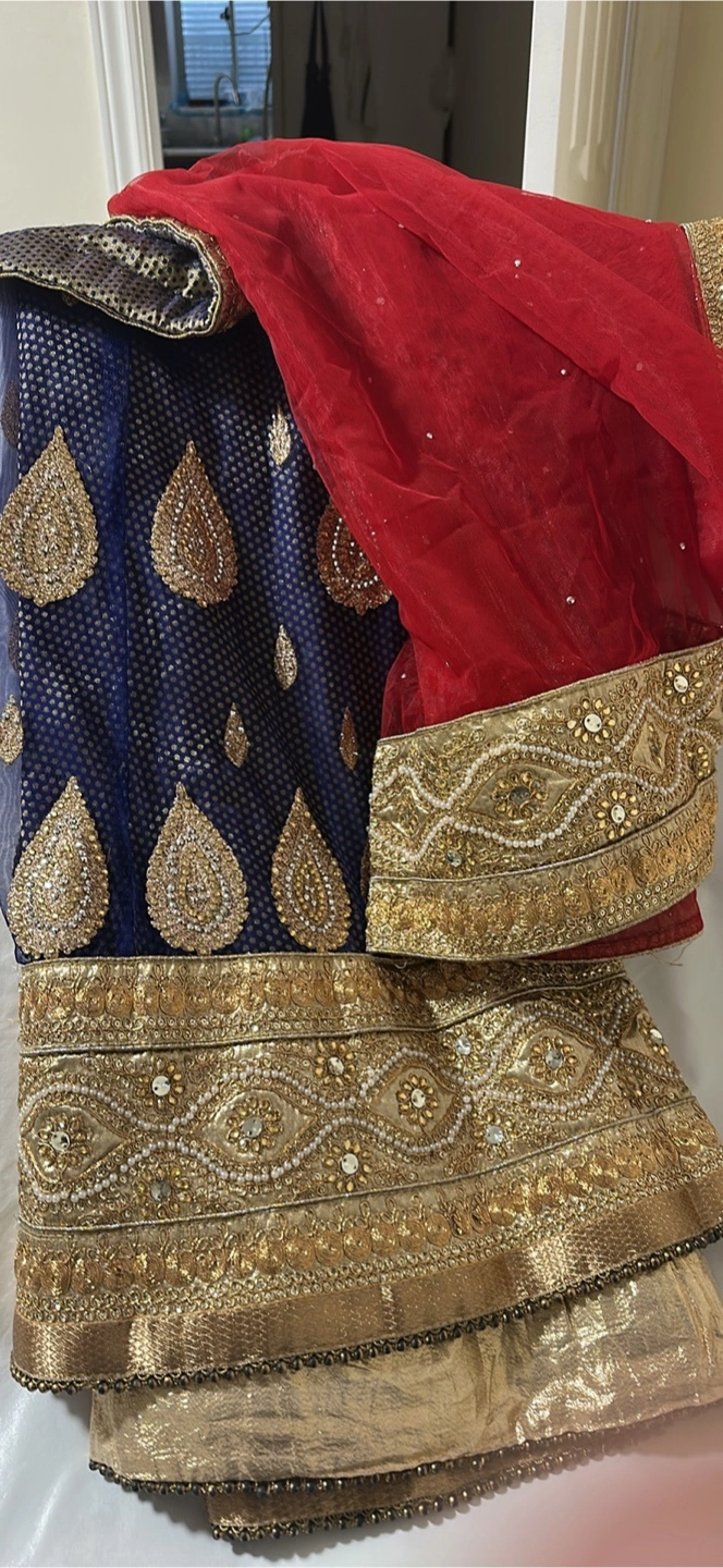 Beautiful Indian Lehenga Choli set with intricate gold detailing. Includes a navy blue skirt and a red dupatta and can be paired with any gold blouse! Perfect for a special occasion! Asking $75 OBO