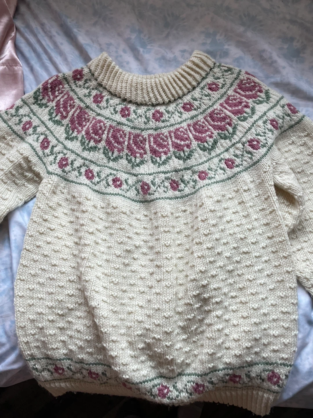 Selling a cozy, hand-knitted cream-coloured wool sweater! It features a lovely floral design around the yoke in shades of pink and green. Perfect for staying warm and stylish during the cooler months. It's in great condition and ready for a new home!