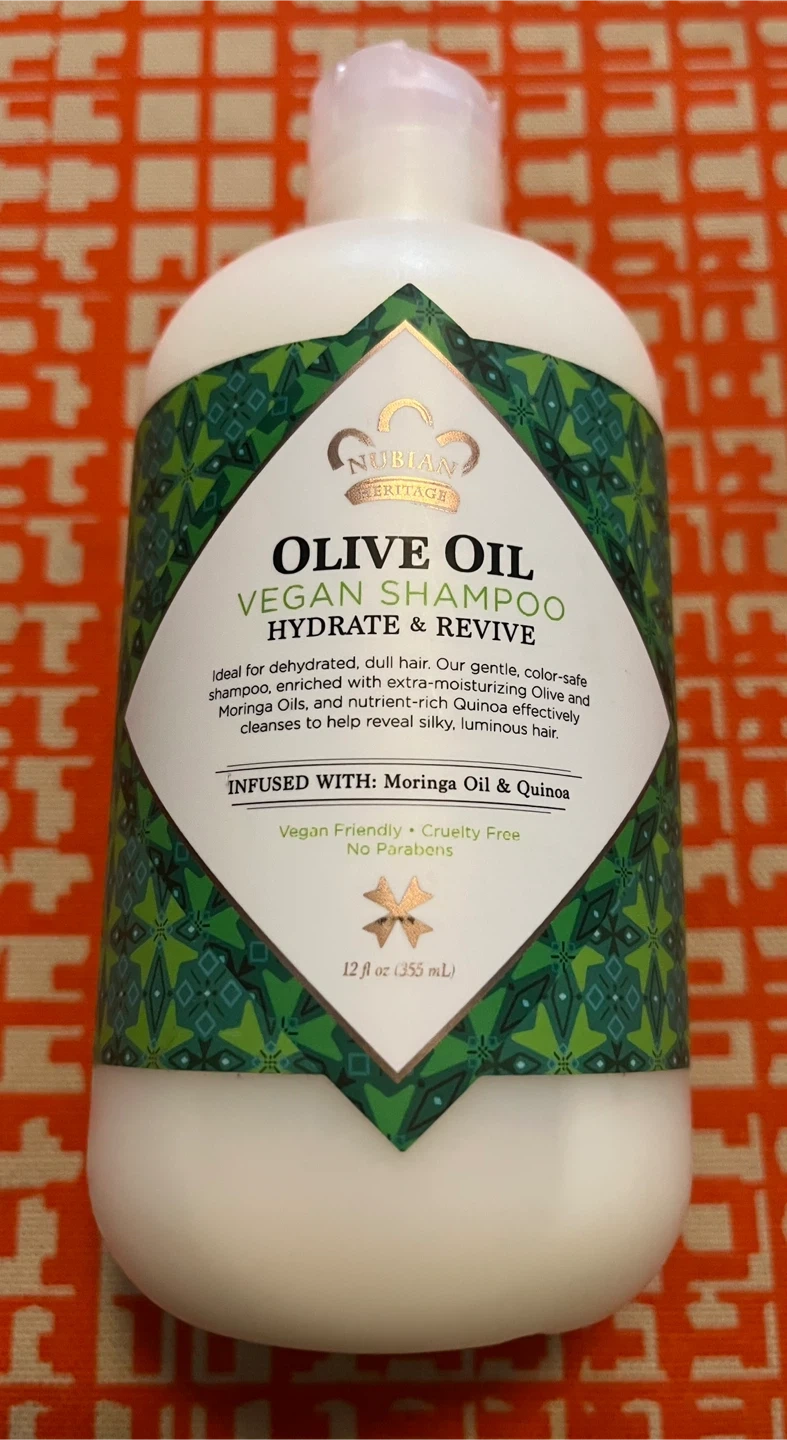 461I'm selling a bottle of Nubian Heritage Olive Oil Vegan Shampoo. It's a gentle, colour-safe shampoo enriched with extra-moisturizing Olive and Moringa Oils, and nutrient-rich Quinoa that effectively cleanses to help reveal silky, luminous hair. It's also infused with Moringa Oil & Quinoa. The bottle contains 12 fl oz (355 mL)