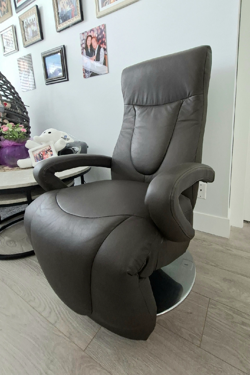 Comfortable brown leather swivel recliner chair in great condition! Perfect for relaxing and unwinding after a long day. The chair reclines smoothly and the swivel base makes it easy to turn. It's a great addition to any living room or den