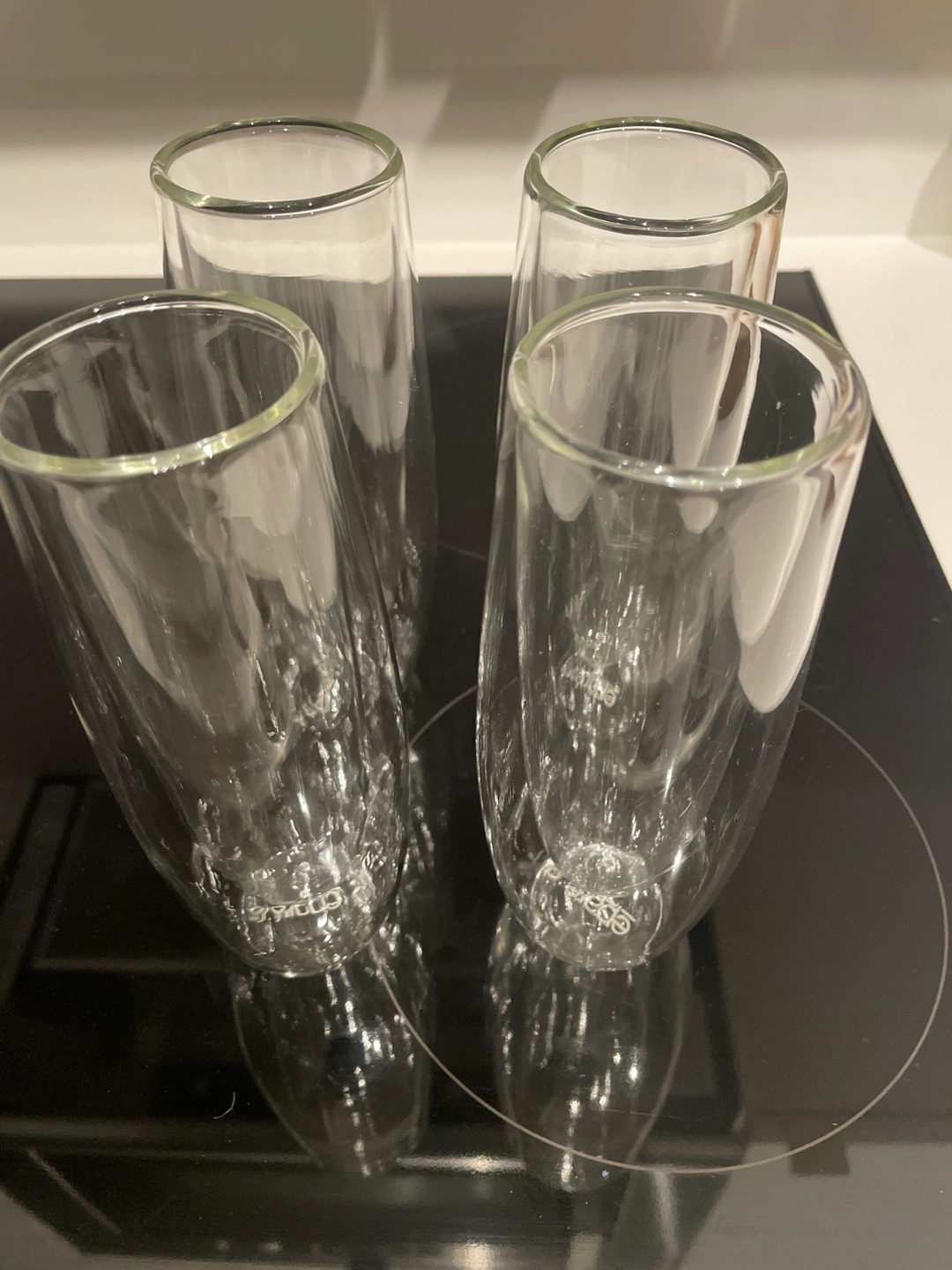 399Selling a set of four Libbey Modern Bar double-walled champagne flutes. These glasses are perfect for keeping your bubbly cold and your hands comfortable. They're in great condition and ready for your next celebration