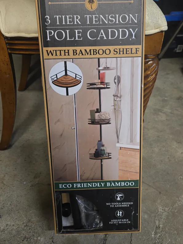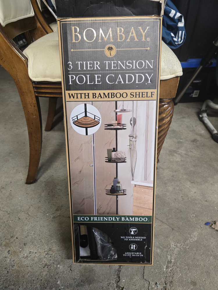 Selling a brand new Bombay 3 Tier Tension Pole Caddy with Bamboo Shelf! It's still in the box and has never been used.