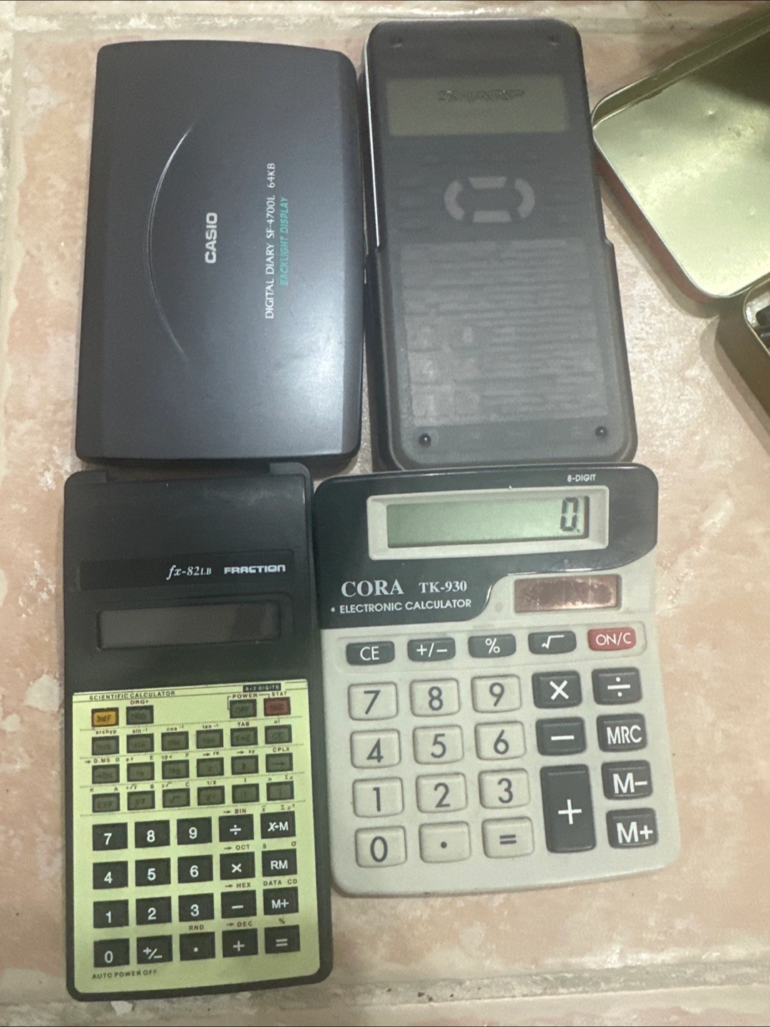 Selling bunch of calculators! Includes a Casio Digital Diary SF-4700L, a Sharp calculator, a Cora TK-930 electronic calculator, and an fx-82LB Fraction scientific calculator Needs battery for sure