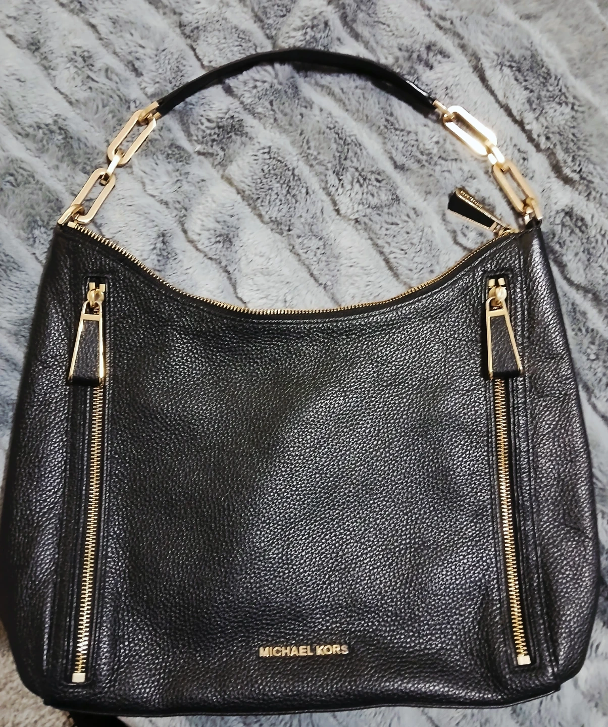 Selling a gently used Michael Kors shoulder bag. It has beautiful black pebbled leather; featuring stylish gold hardware and a chunky gold chain link shoulder strap.