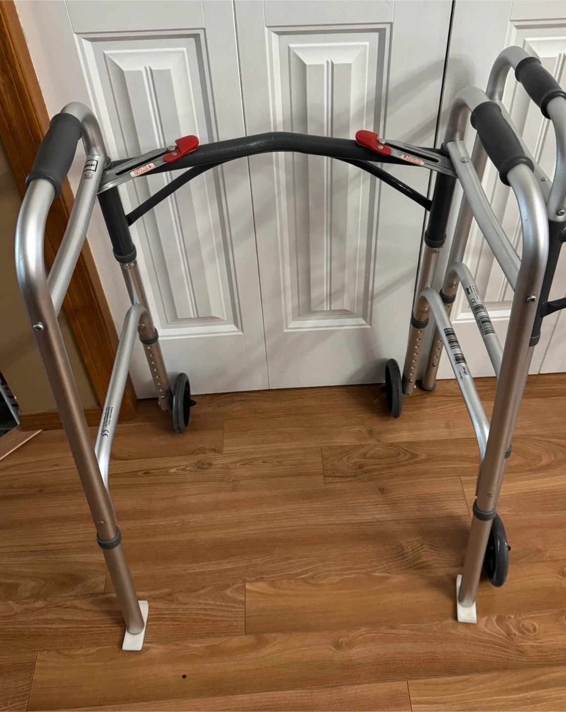 Selling a used silver walker with wheels. It's in great condition and ready to help someone get around safely and comfortably. It features adjustable height settings to suit different users
