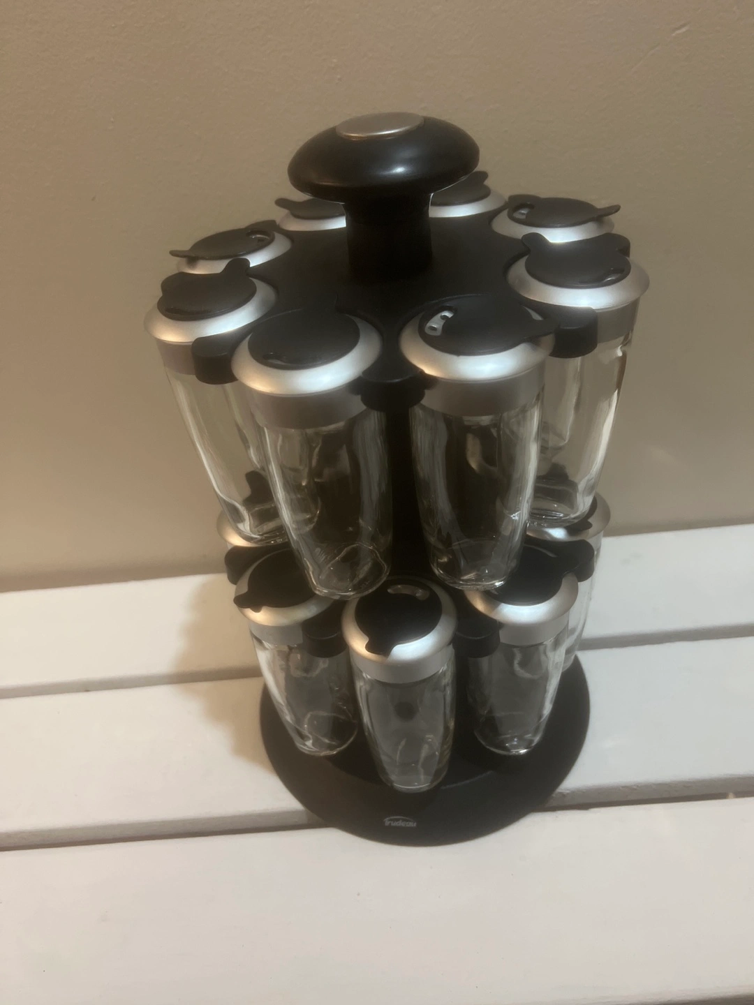 Selling a Trudeau spice rack carousel. It's in great condition and ready to organize your spices! It features a rotating design for easy access to all your favourite 16 seasonings. From a clean home. No damage.