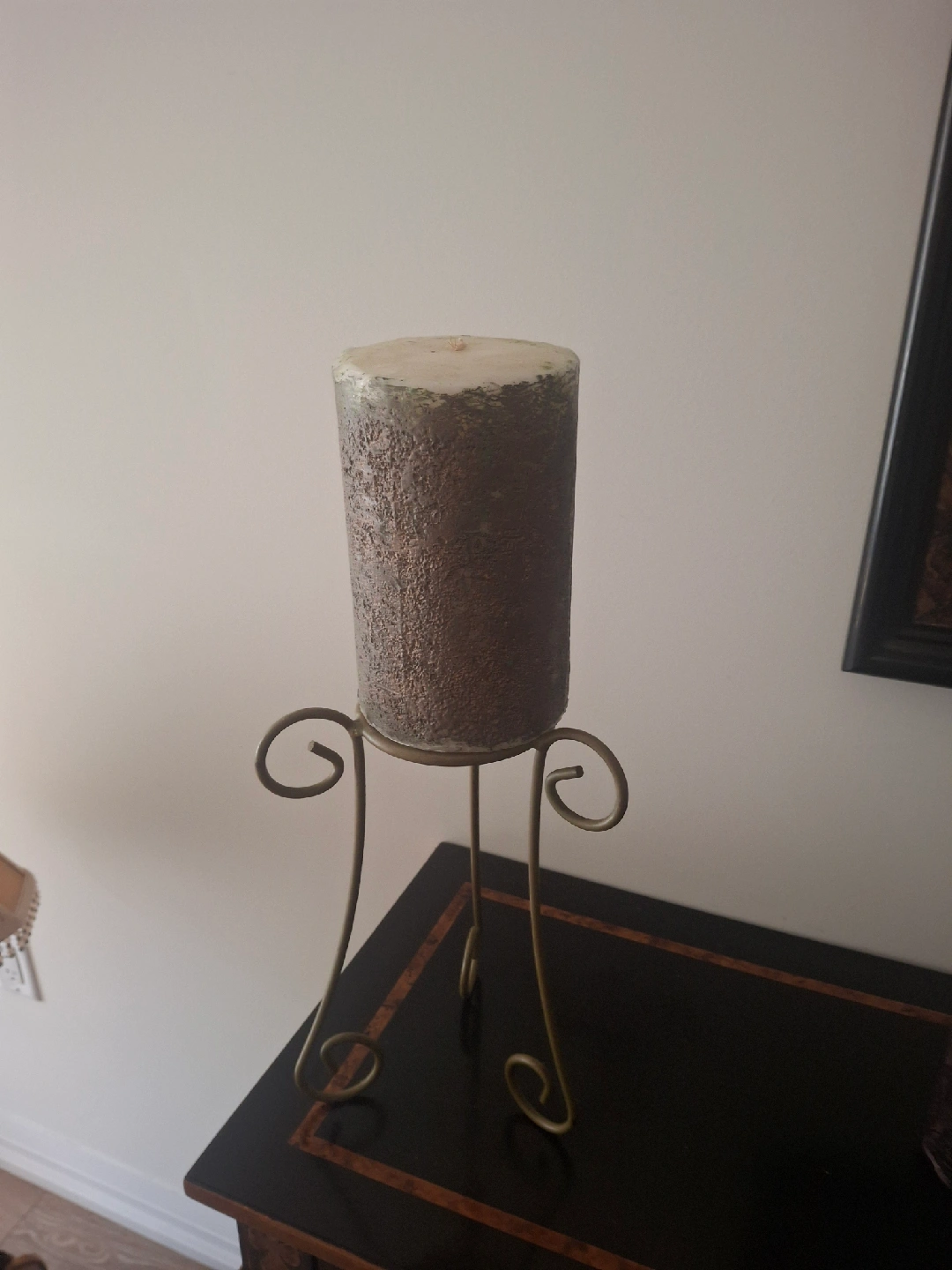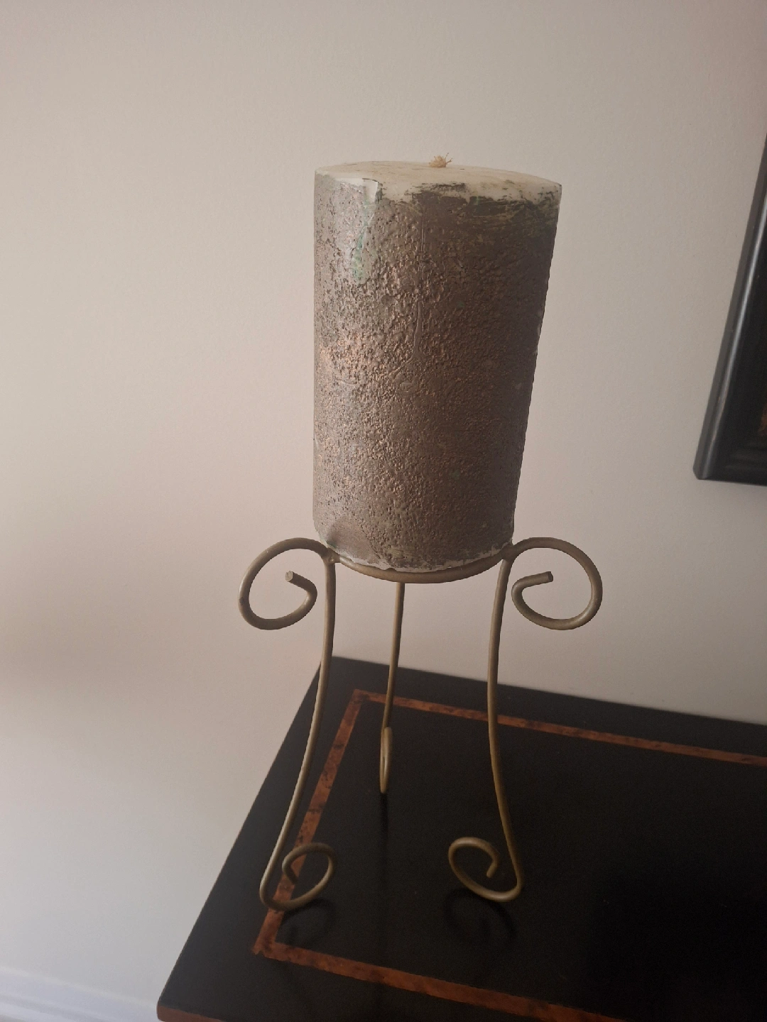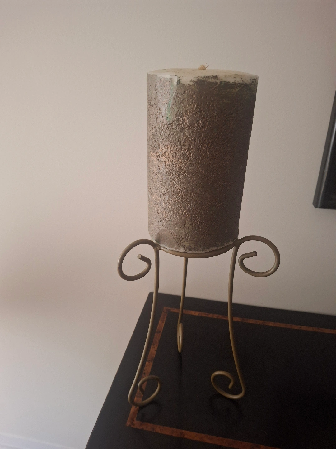 Selling a unique decorative candle with a metal stand. It adds a touch of elegance to any room. The candle has a textured finish, and the stand features a curly design. Perfect for creating a cozy atmosphere!
