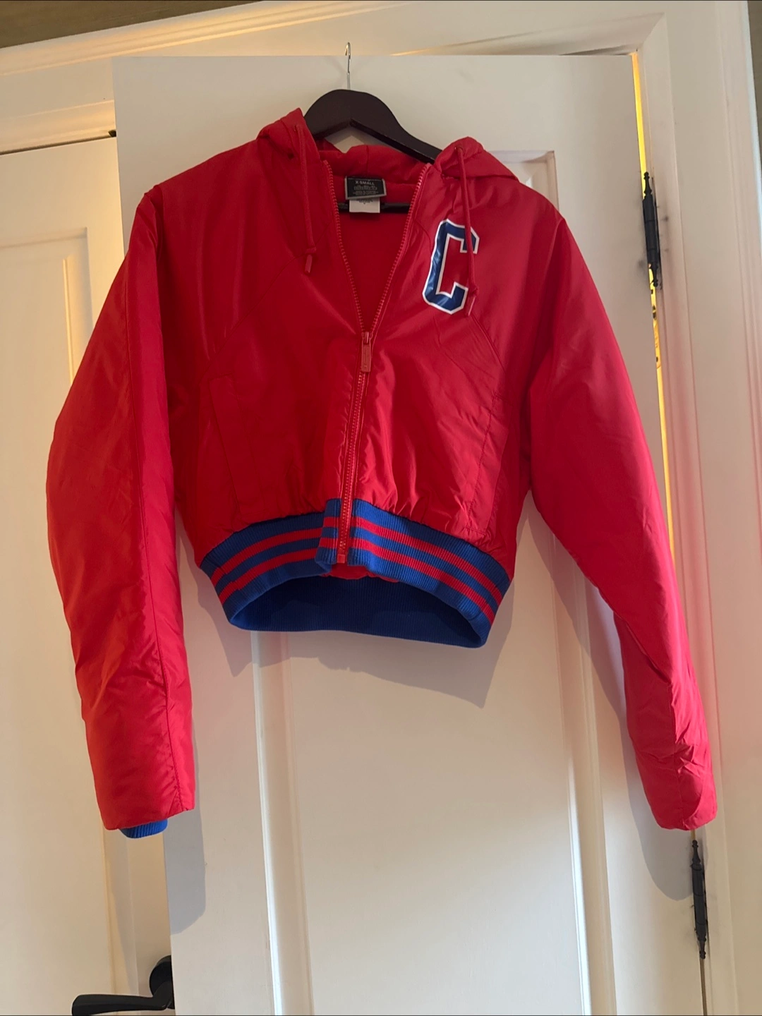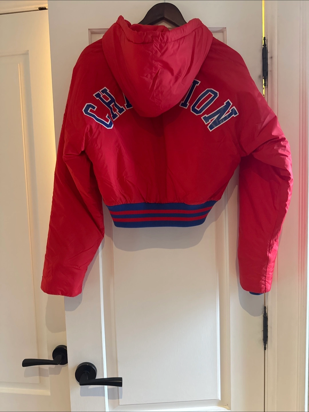20Selling a bright red Champion cropped puffer jacket! It's in great condition and perfect for adding a pop of colour to your wardrobe. The jacket features a hood and a sporty, cropped fit. It has blue and white details on the cuffs and hem. A stylish and cozy choice for cooler days!