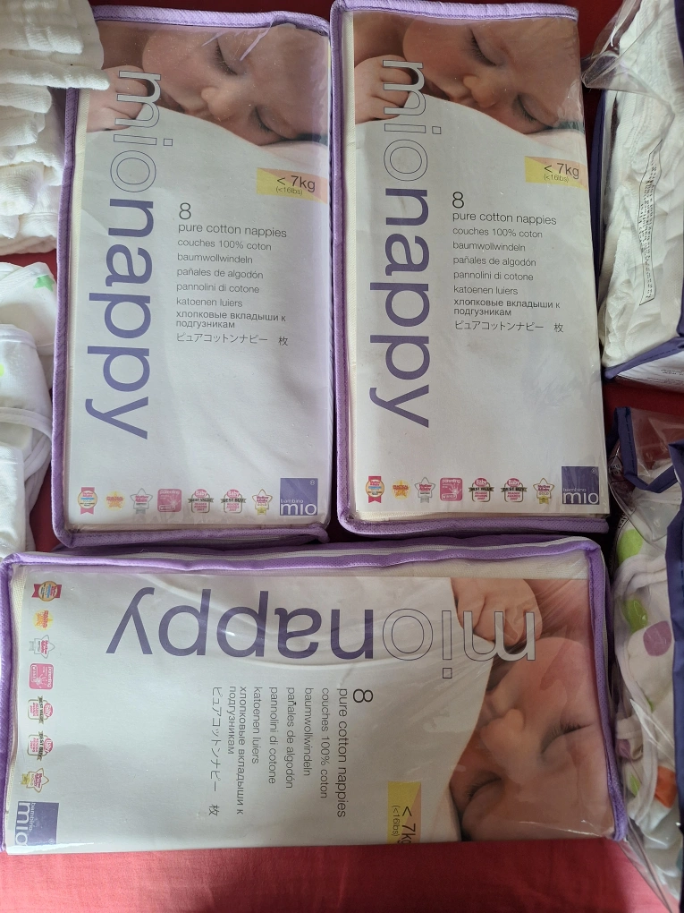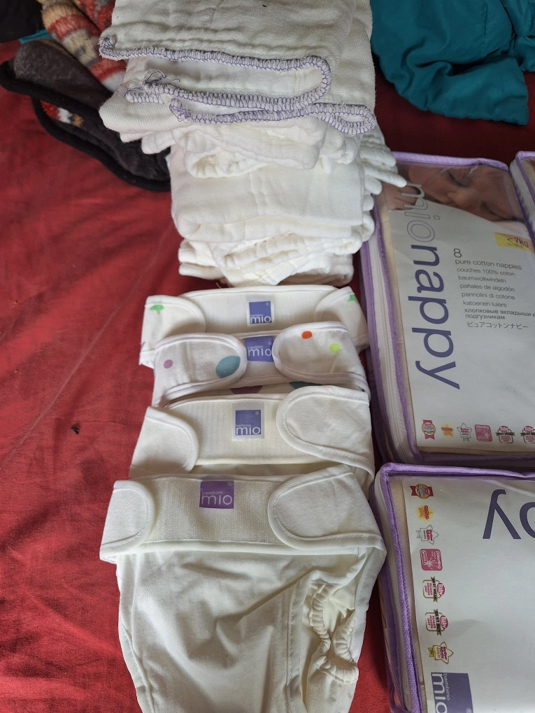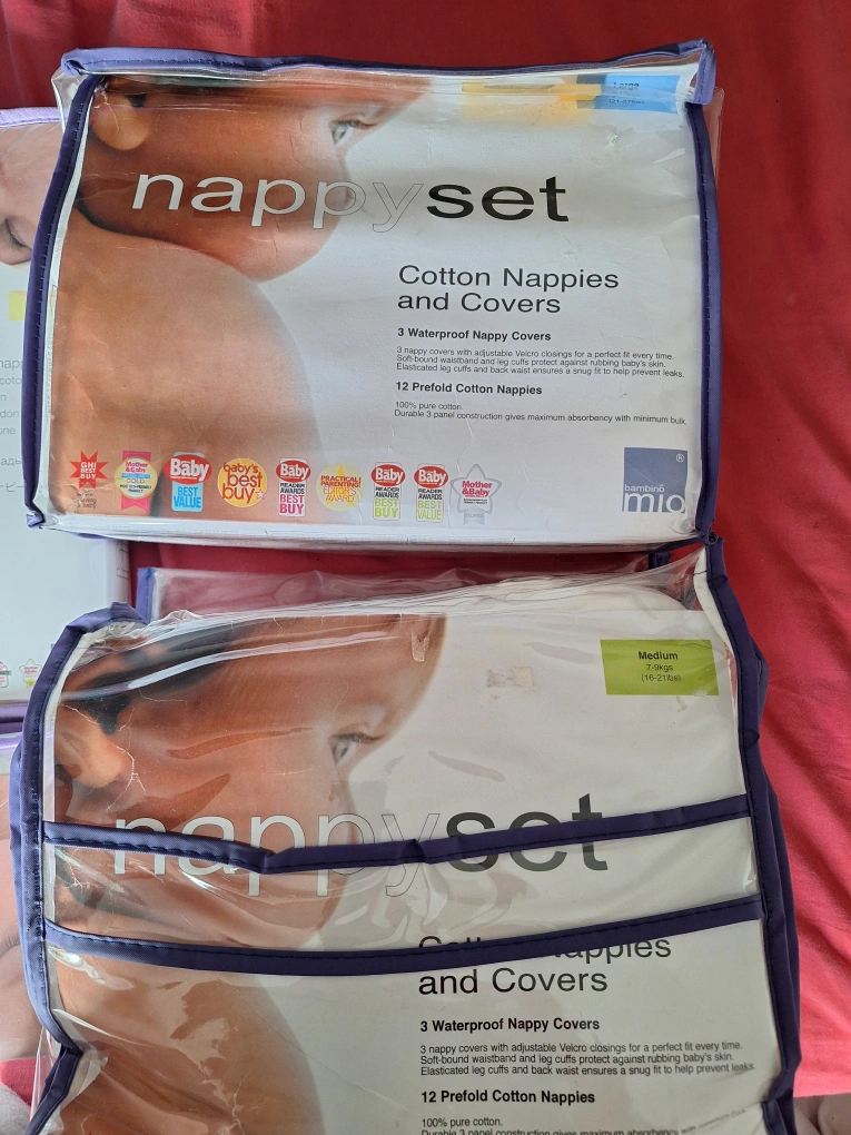 60I have bambino mio mionappy and nappy set for sale. -Mionappy: 8 pure cotton nappies, suitable for babies under 7kg. -Nappy Set: Cotton nappies and covers, including 3 waterproof nappy covers and 12 prefold cotton nappies . also size medium tob21lbs and large to 27lbs (the bigger bags).