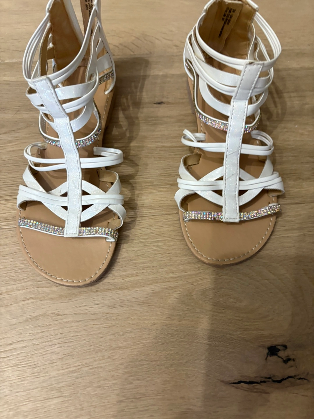 Cute white gladiator sandals, perfect for summer! They feature sparkly accents and a comfortable sole. Great for dressing up or down