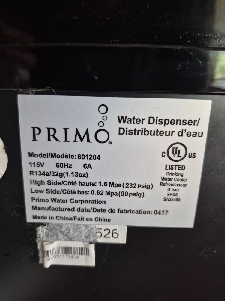 Selling a Primo water dispenser, model 601204. It hasn't been used in over a year, but it's in good working order and ready to use. It's a convenient way to have both hot and cold water available at home or in the office. It should be rinsed and flushed out to give it a good internal cleaning.