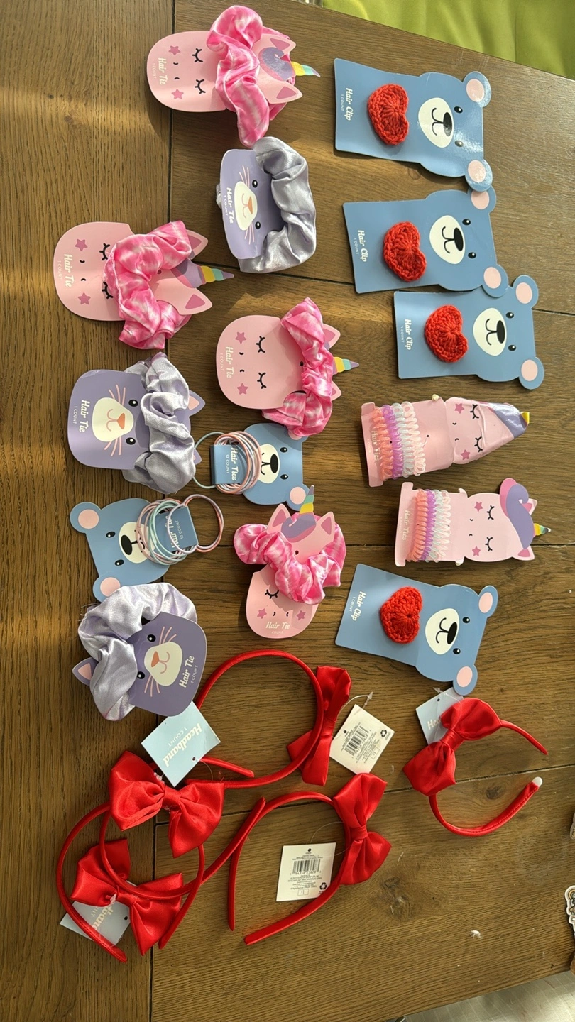 A selection of cute hair accessories for kids! Includes hair ties with unicorn and kitty designs, bear-themed hair clips, and red bow headbands. All new with tags!