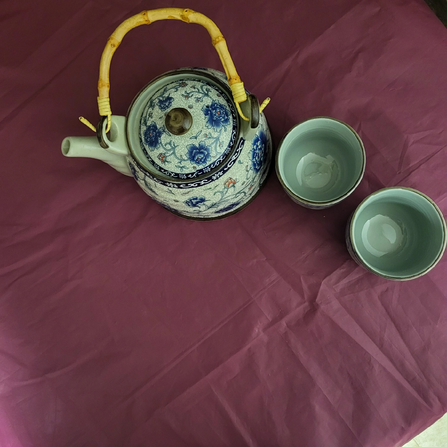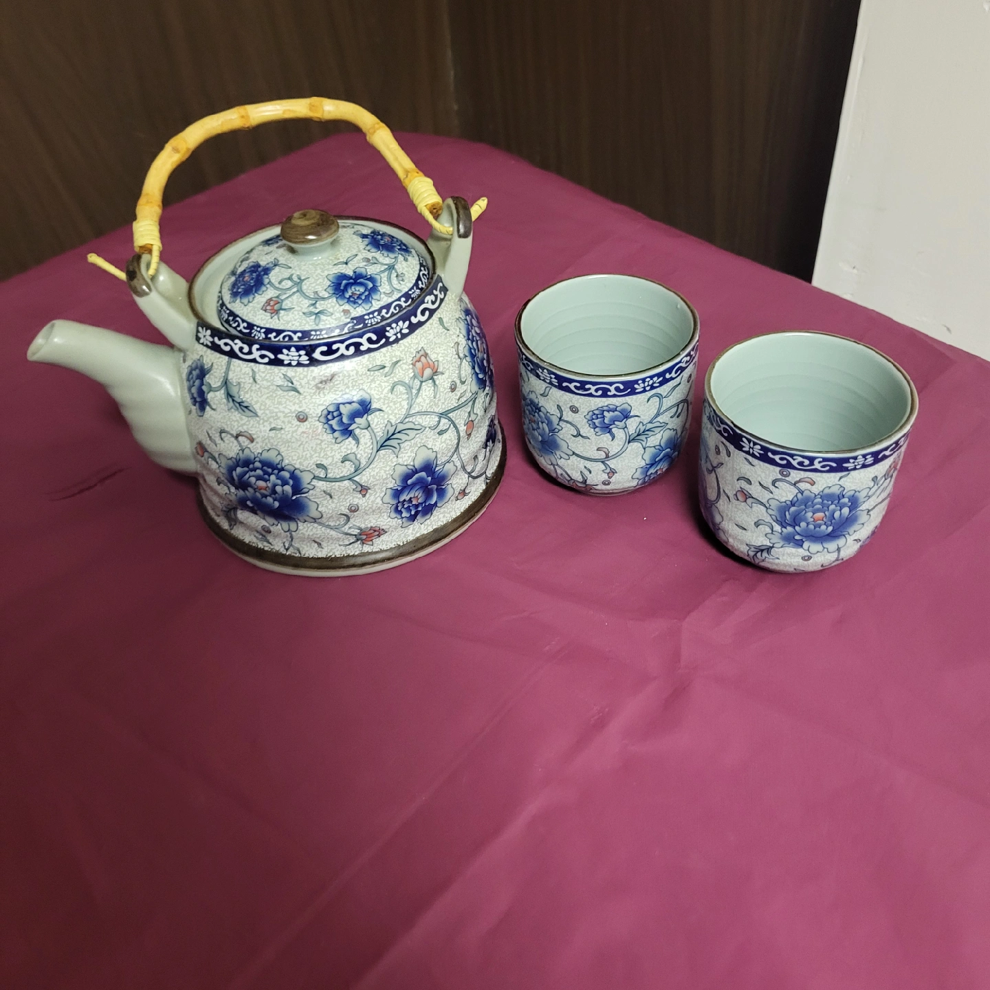 220Lovely Adeline tea set featuring a teapot with a bamboo-style handle and two matching cups. The set is decorated with a delicate blue and white floral pattern. Perfect for enjoying a cozy cup of tea!