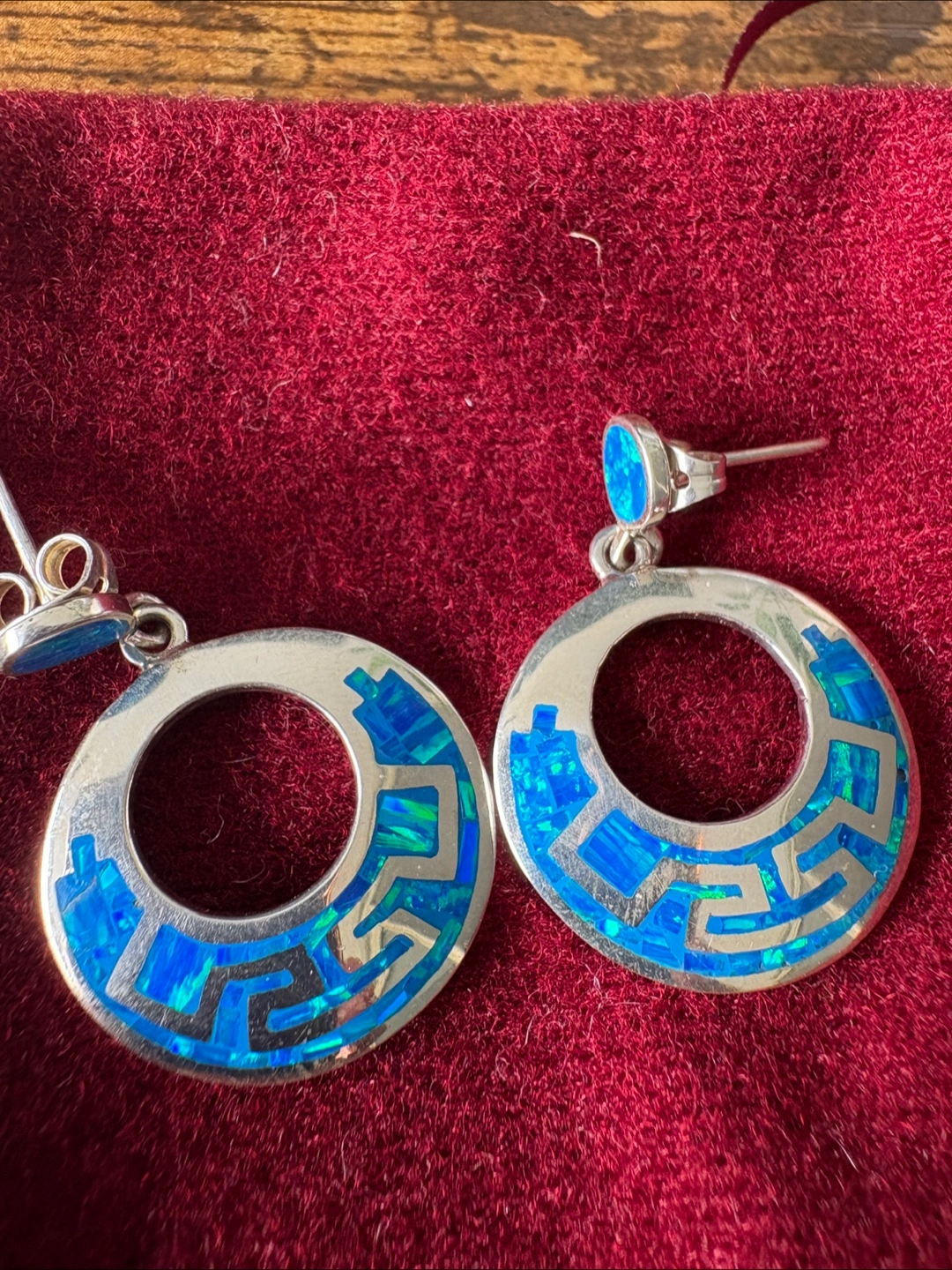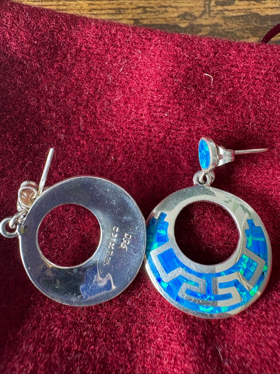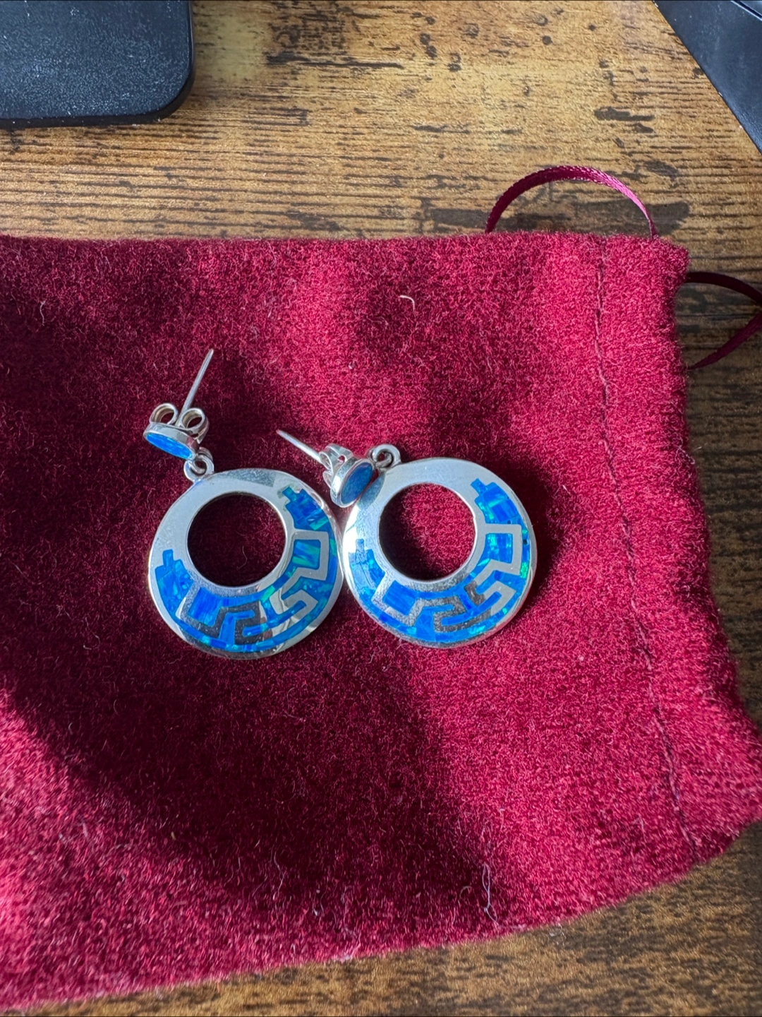 great for gift !!! Selling a pair of vintage earrings marked Mexico 925. They feature a circular design with inlaid blue opal. They are new and come with a red velvet pouch