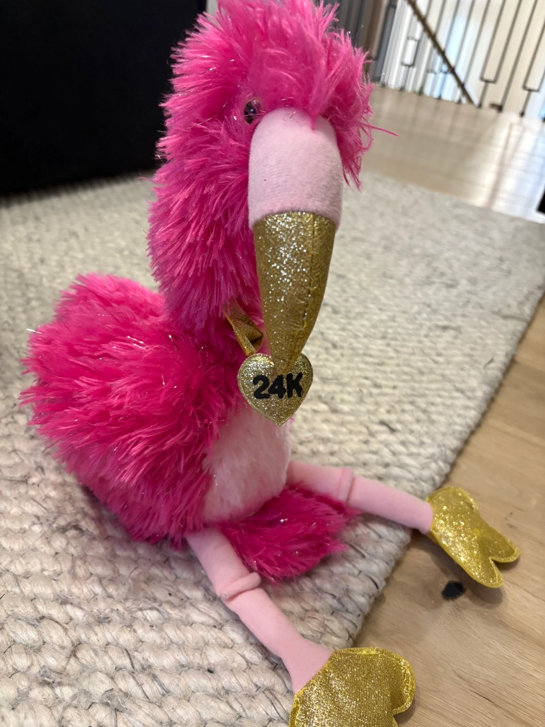 This is a cute pink flamingo plush toy. It has a gold glitter beak and feet. There is a heart with 24K on it. It is in good condition and ready for a new home! Also sings 24K Bruno Mars