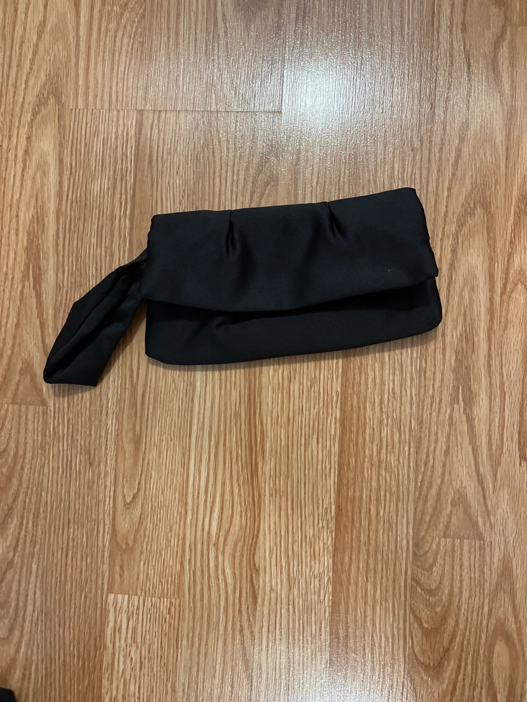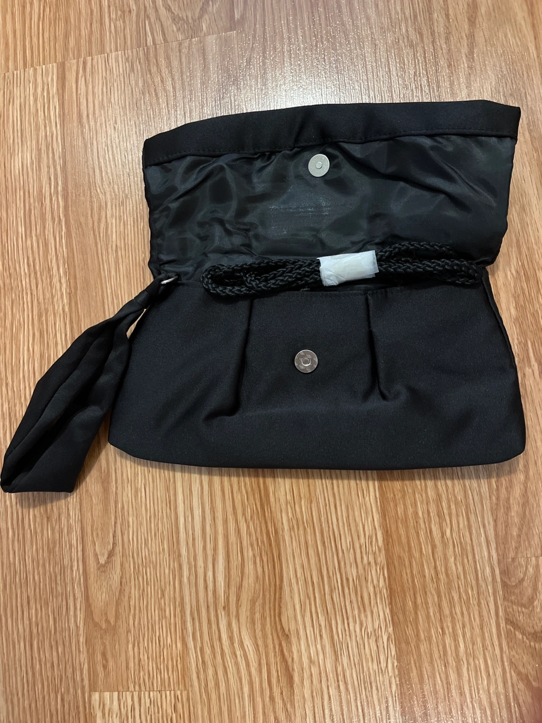 A simple black clutch purse, perfect for evenings out or special occasions! It has a magnetic clasp closure and a wrist strap for easy carrying. The interior is lined with a silky material.