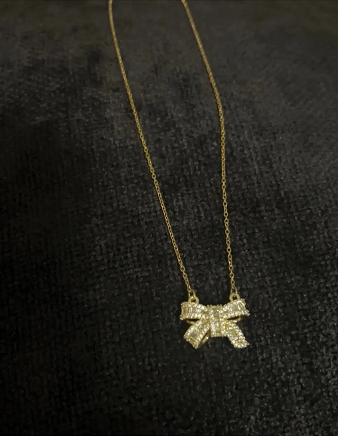 Selling a cute gold necklace with a bow pendant. It's in great condition and would make a lovely addition to any outfit! The bow is adorned with small stones that catch the light beautifully. Perfect for adding a touch of elegance to your everyday look