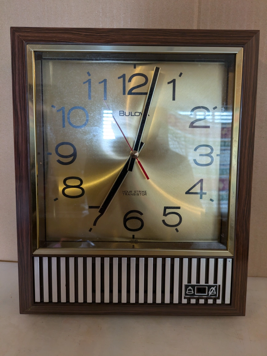 1970s Bulova Wall Clock , plastic with simulated wood grain . runs great and chimes on the hour and half hour . ( This feature can be turned off ) . Measures 15 inch tall , 11 inches wide and 3 inches deep . Nice condition no flaws . Cash payment please , Thanks for looking .