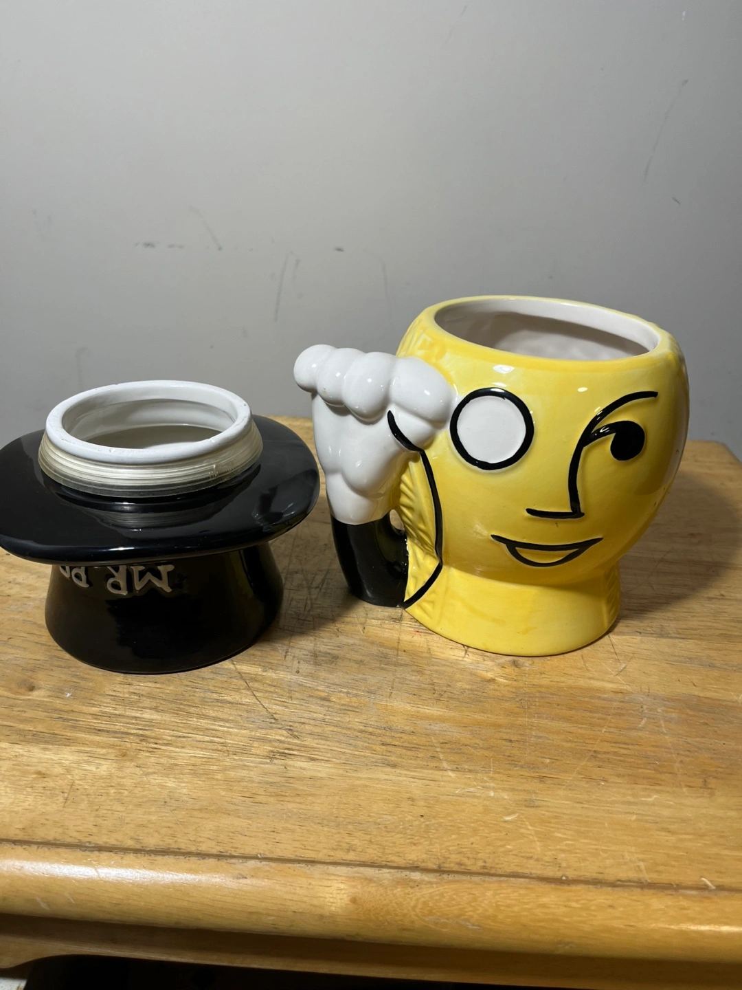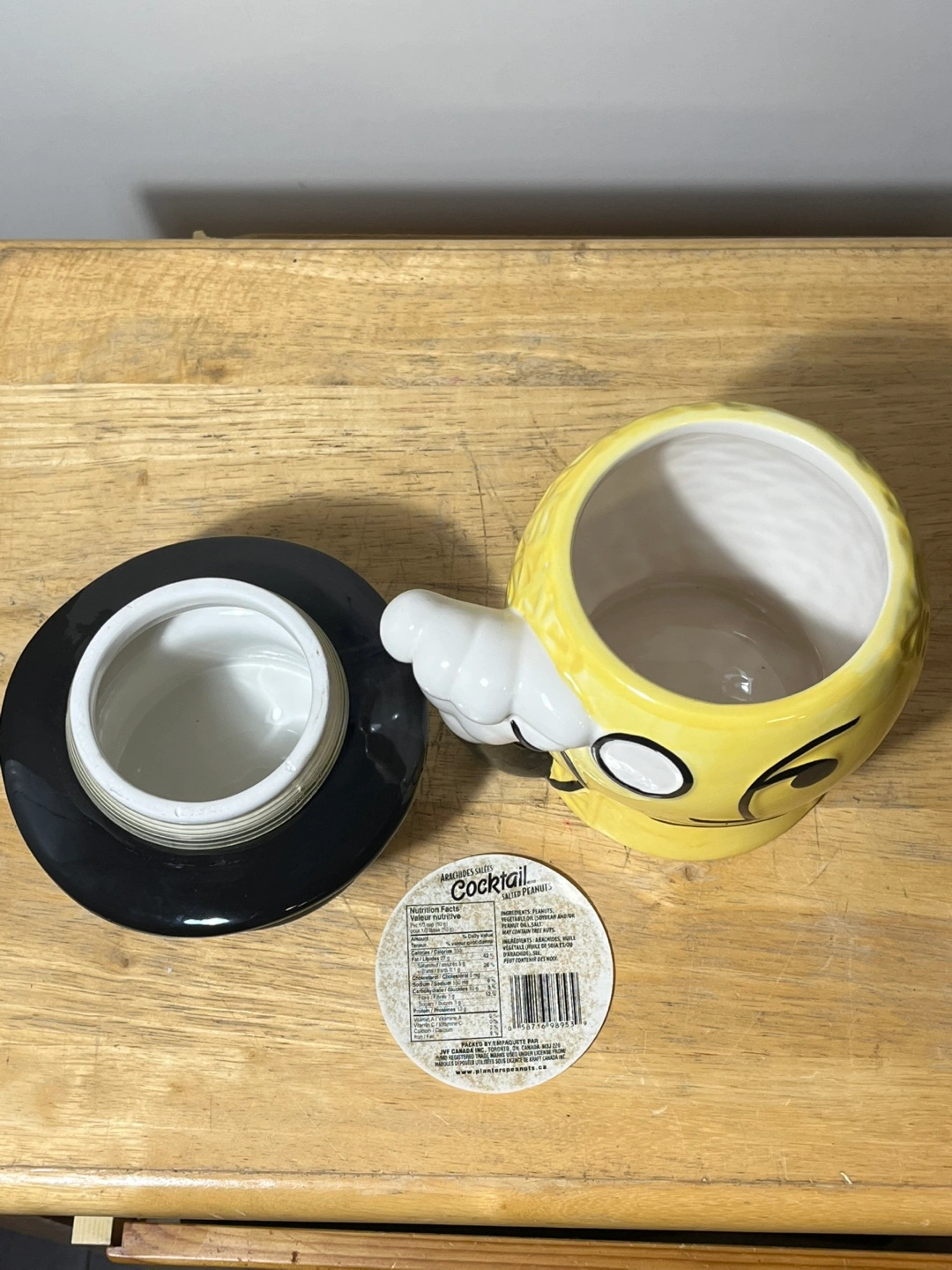 Here's a fun Planters Mr. Peanut ceramic cookie jar! It's in great shape and ready to hold your favourite treats. The jar features Mr. Peanut's iconic monocle, top hat, and welcoming gesture. It's a unique piece for any collector or peanut butter lover