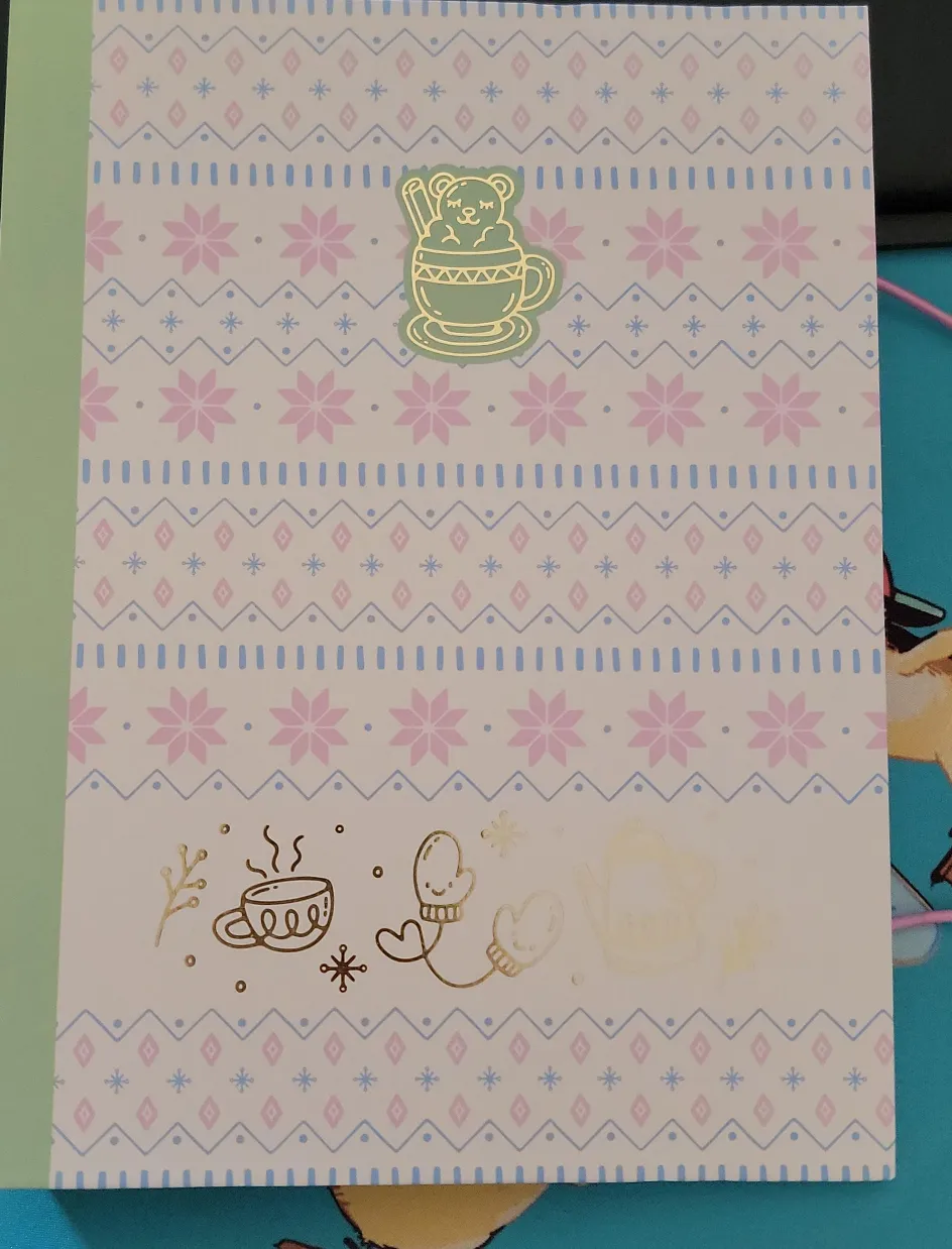 Stickiiclub binder. It has a cute design with teapots, cups, mittens, and cute little bear creature in a fluffy cup with a cinnamon stick. It's in great condition and ready for a new home.