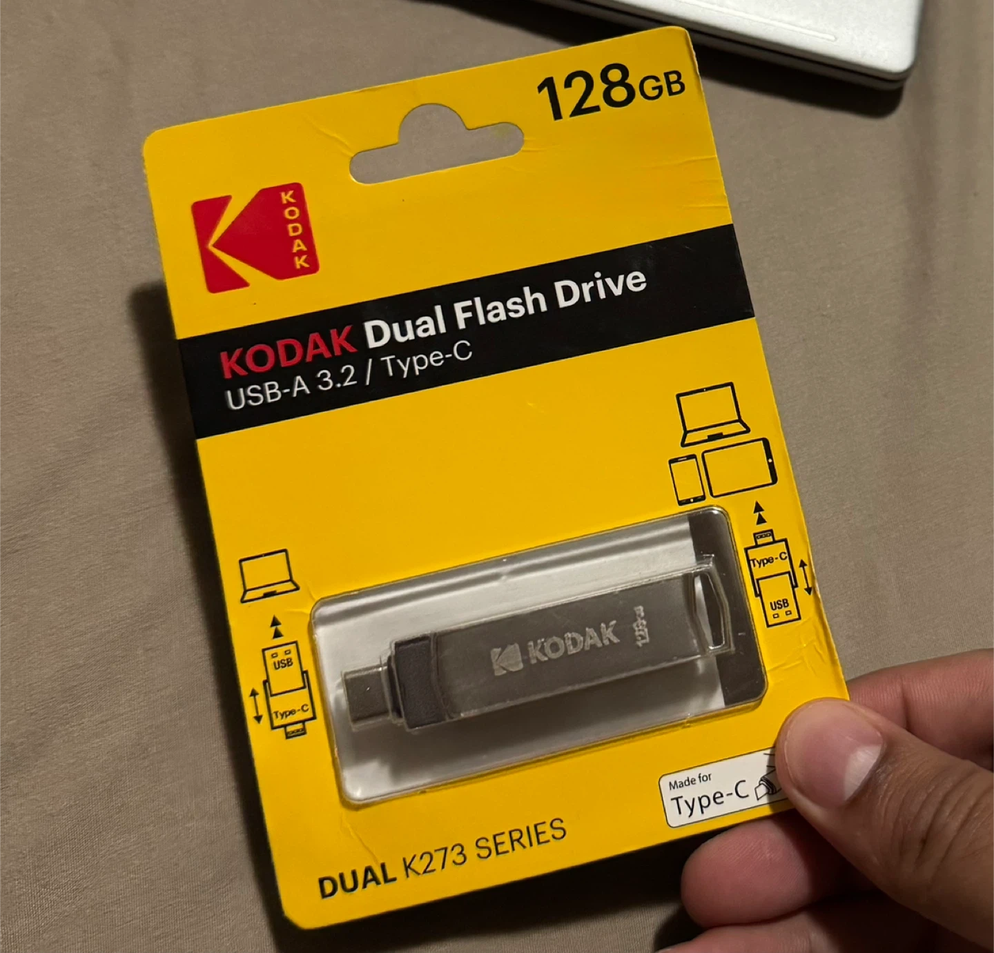 Selling a brand new Kodak 128GB Dual Flash Drive! It features both USB-A 3.2 and Type-C connectors, making it super versatile for different devices.