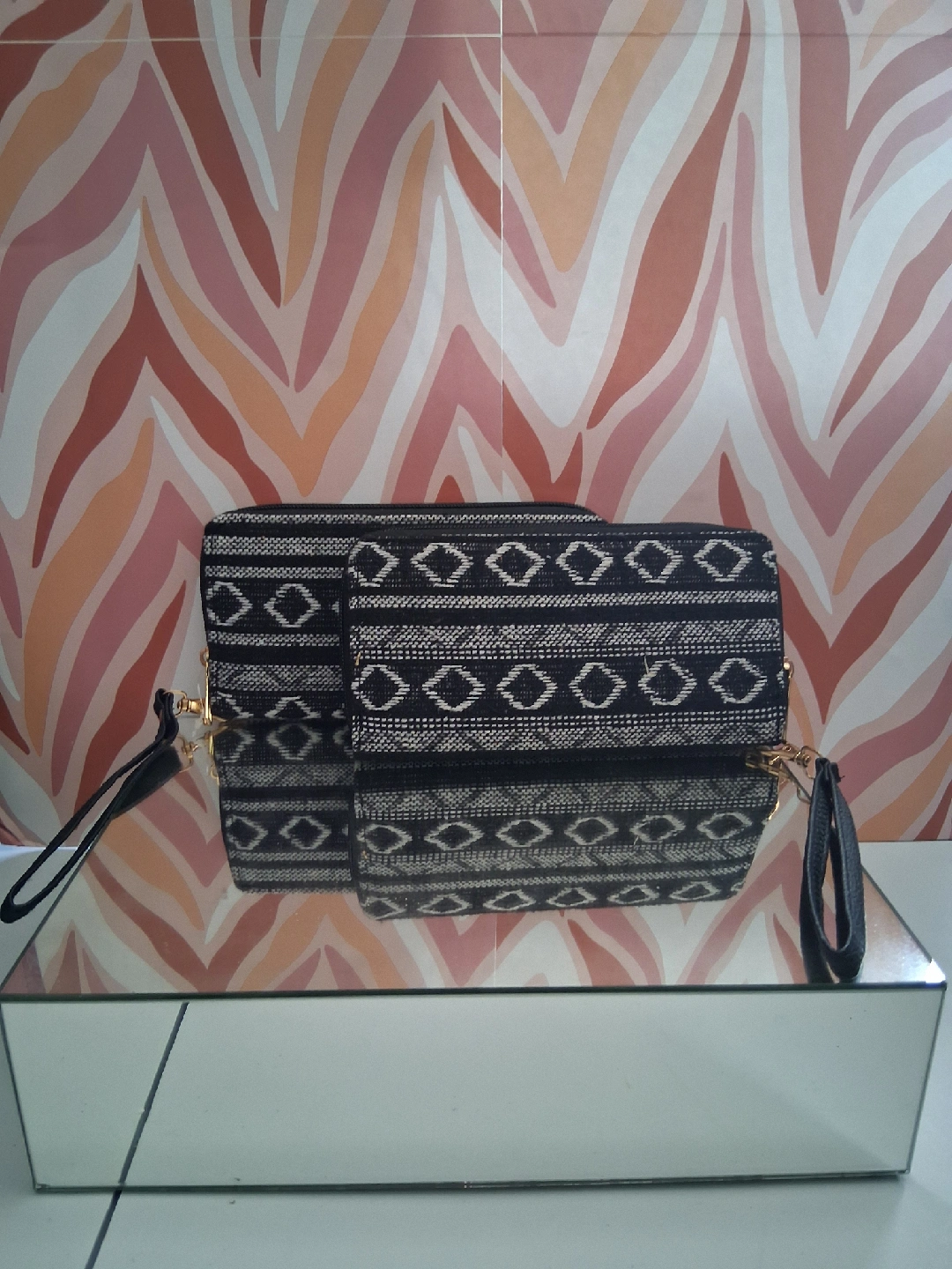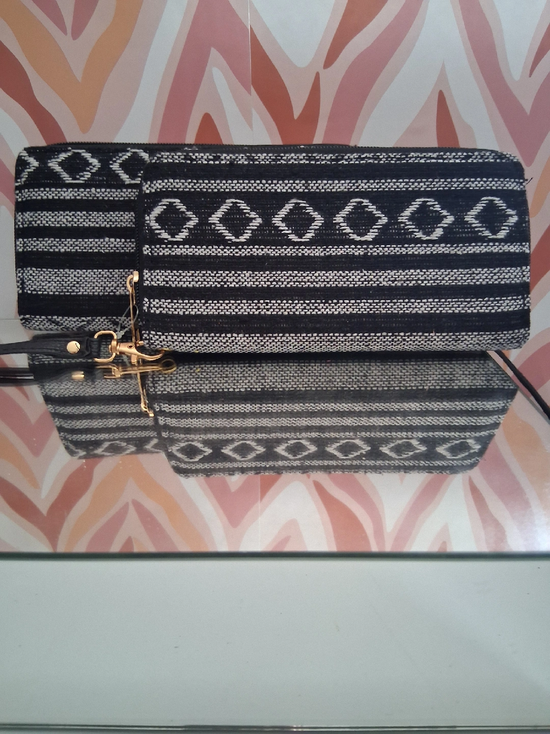147This is a cute black and white patterned clutch. It has a zipper closure and a wrist strap. Perfect for carrying your essentials!. $6.00 ea.