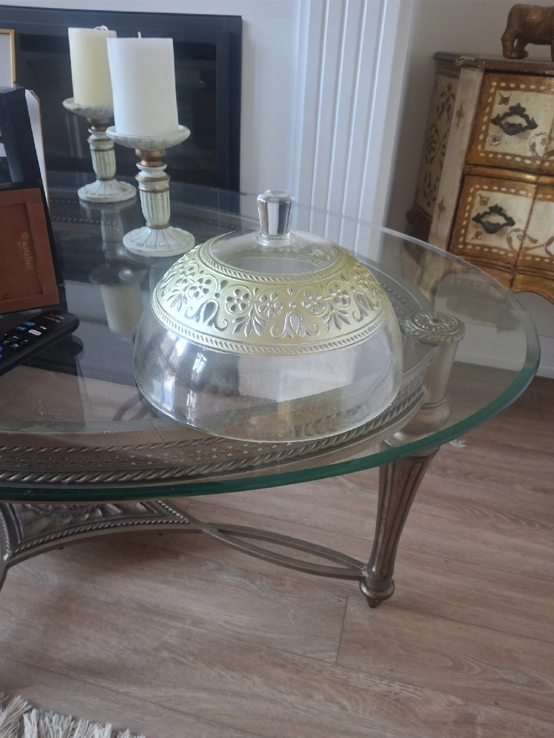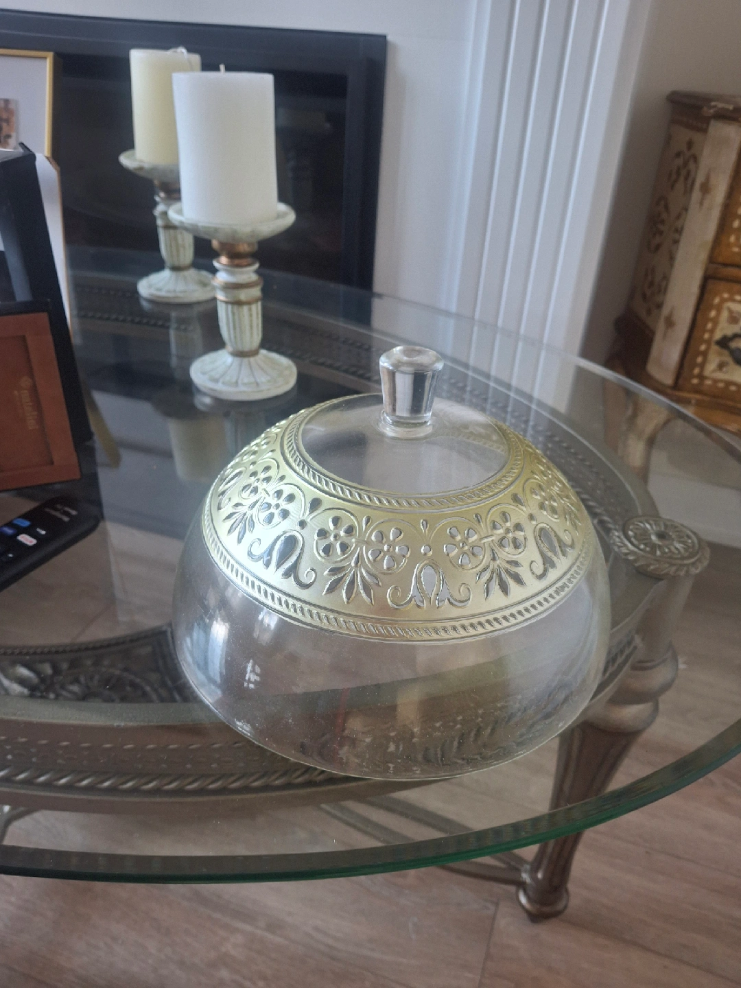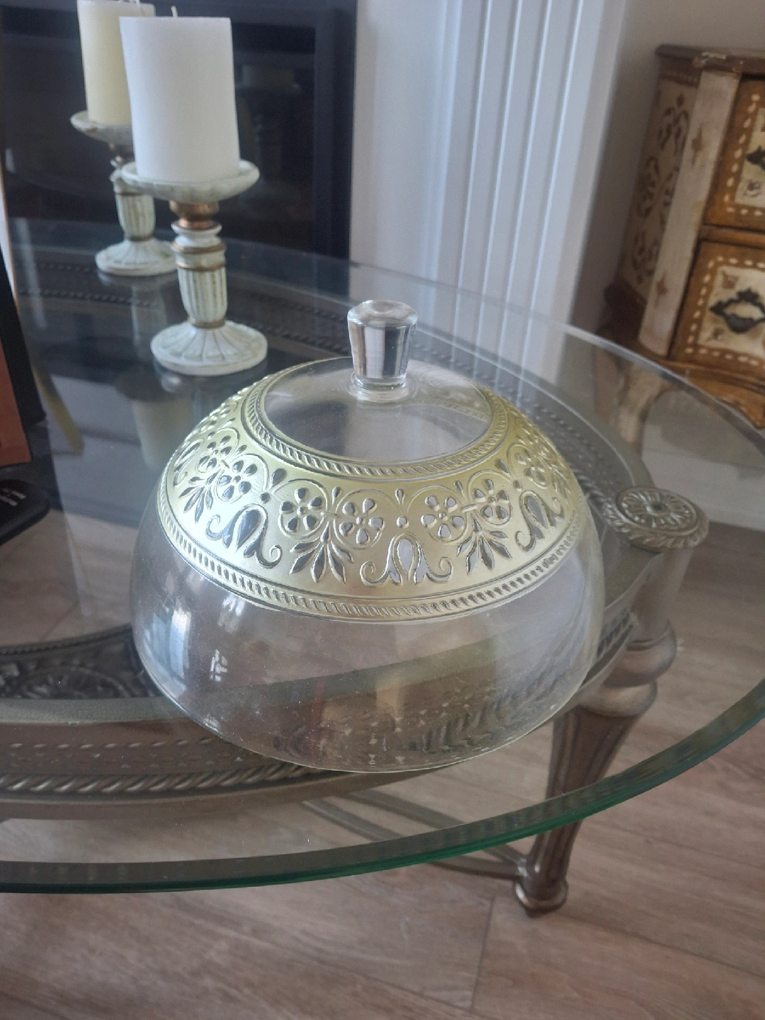 Selling a lovely glass dome cake cover. It's perfect for displaying your baked goods or other treats. The dome keeps everything fresh and looks elegant on any table. It's in great condition and ready for a new home!