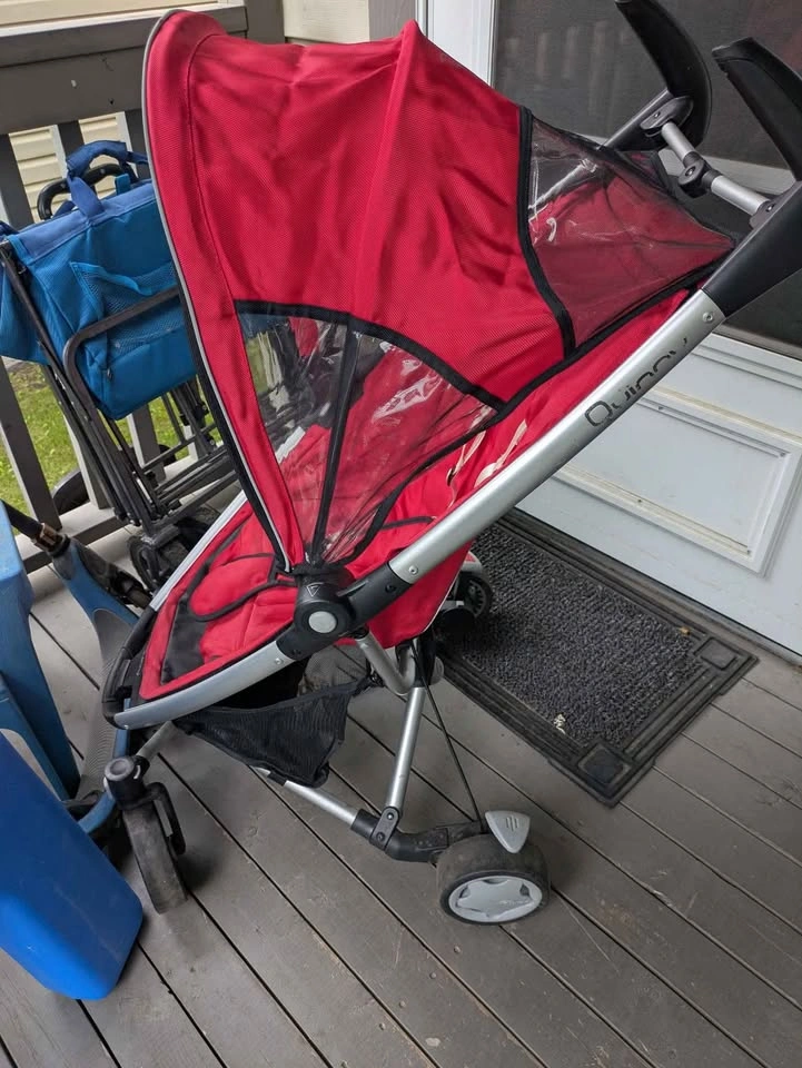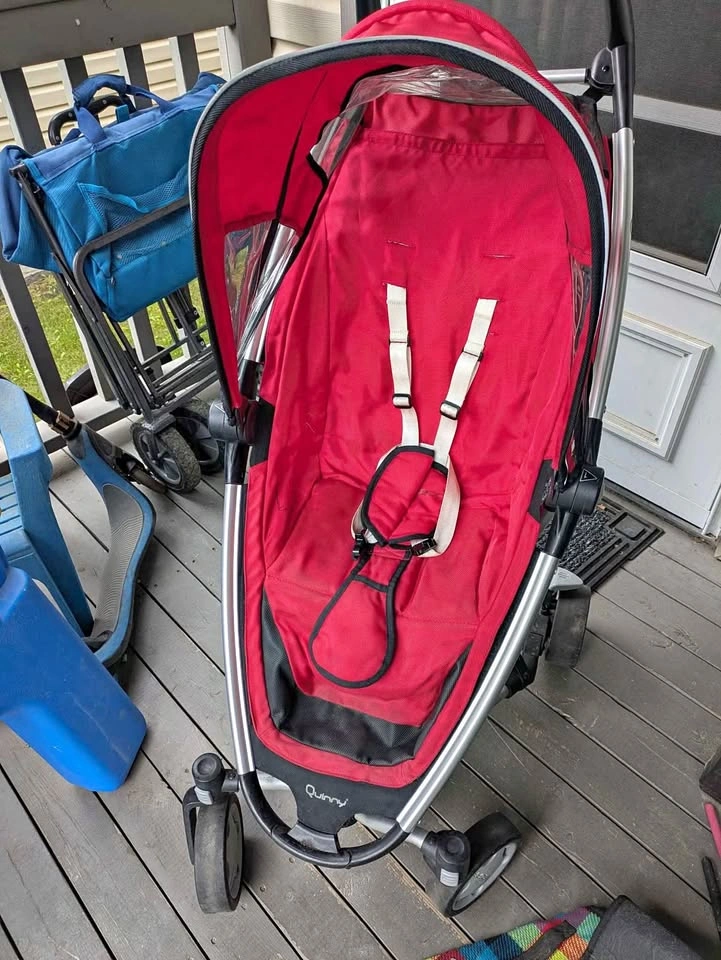 Red Quinny Zapp Stroller. Nice handling and lightweight! Folds down nice and small and fits into a handy carrying bag. Includes manual, rain cover and bag. EUC. Porch pick up in Hamptons. Pet free, scent free, smoke free home. Cash preferred