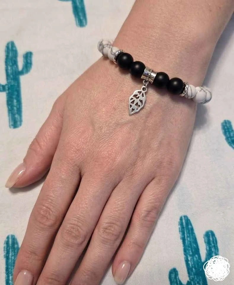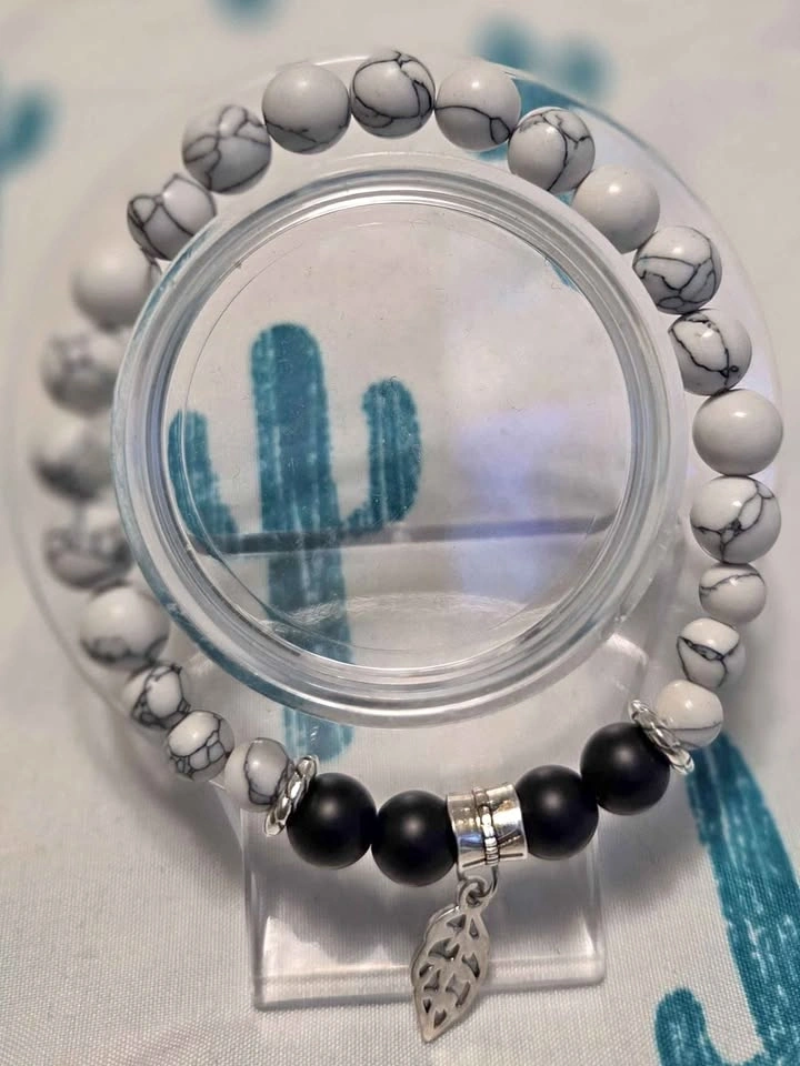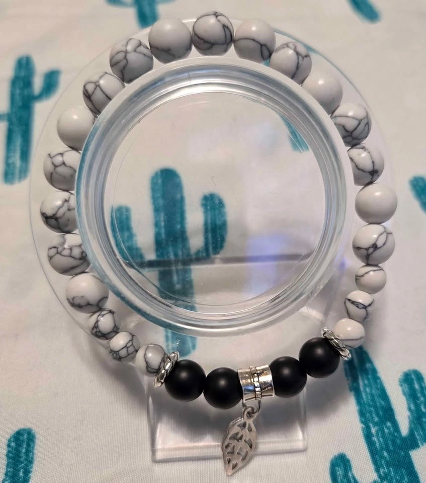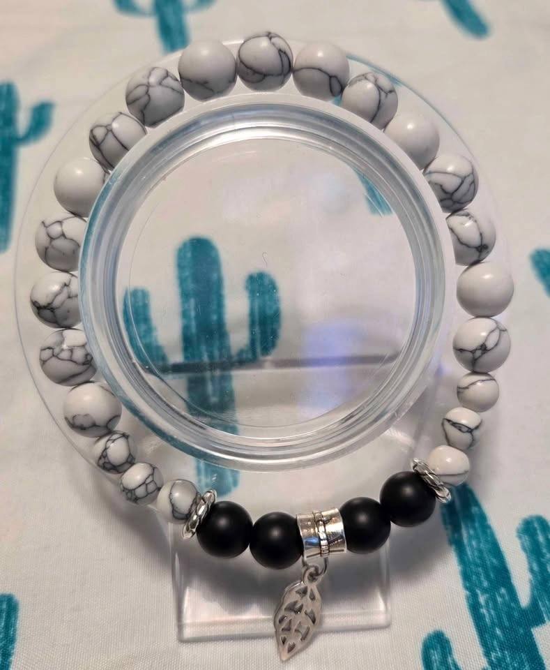 Looking to add a touch of balance and style to your accessory collection? This handcrafted stretch bracelet features a striking contrast of natural-look textures and modern accents. Gemstones: Features beautiful white Howlite (marble-style) beads with charcoal veining and matte Black Onyx (style) accents. Beads size: 8mm and 6mm. Charms: Finished with a detailed silver-tone leaf pendant and decorative spacer beads. Fit: Made with high-quality elastic cord for a comfortable, one-size-fits-most stretch. This piece is perfect for layering with a watch or wearing solo as a statement piece. Its monochromatic palette makes it versatile enough to pair with anything from a casual t-shirt to a dressier outfit. Available for local pickup in Oakville.