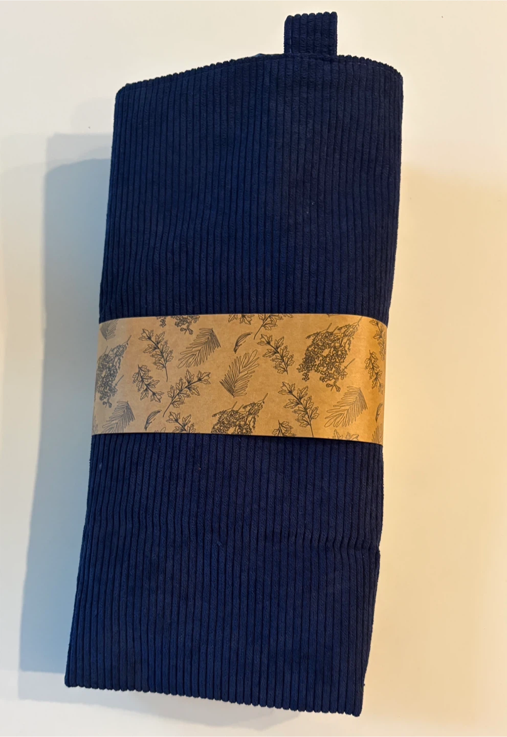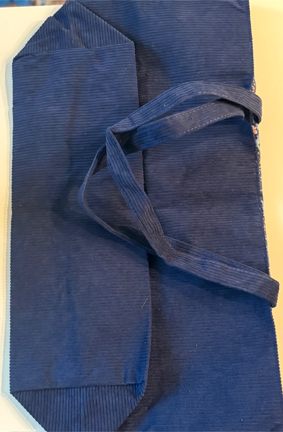 Navy blue corduroy tote bag with a cute floral print lining. It has a handy tie closure. This bag is roomy and great for everyday use!