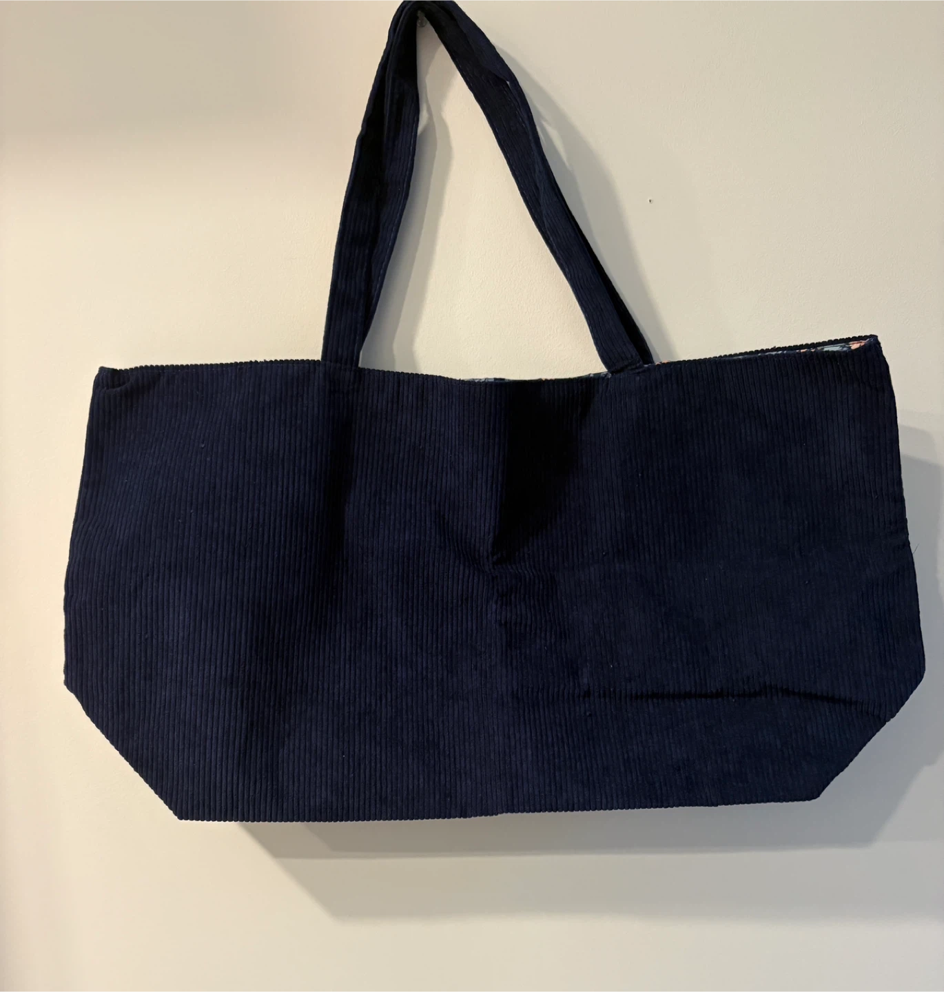 Navy Blue Corduroy Tote Bag with Floral Lining