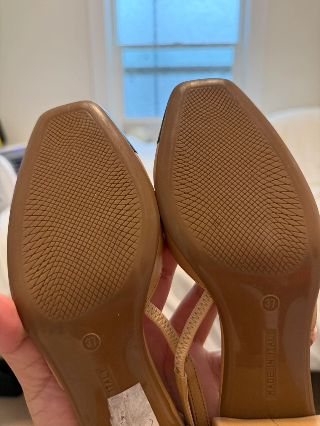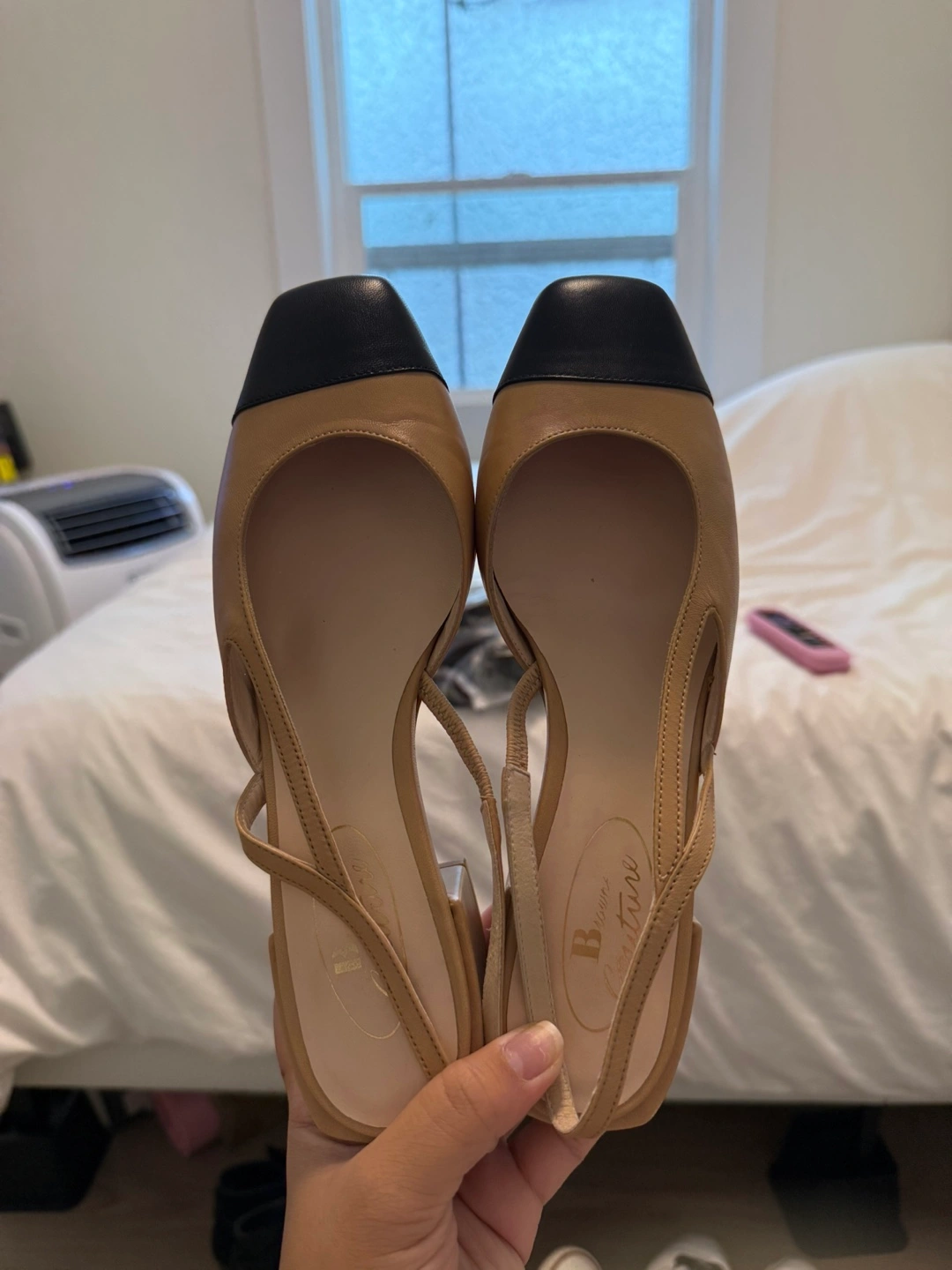 These are a pair of Brown Couture slingback heels. They feature a beige body with a black cap toe. They would be a great addition to your wardrobe!