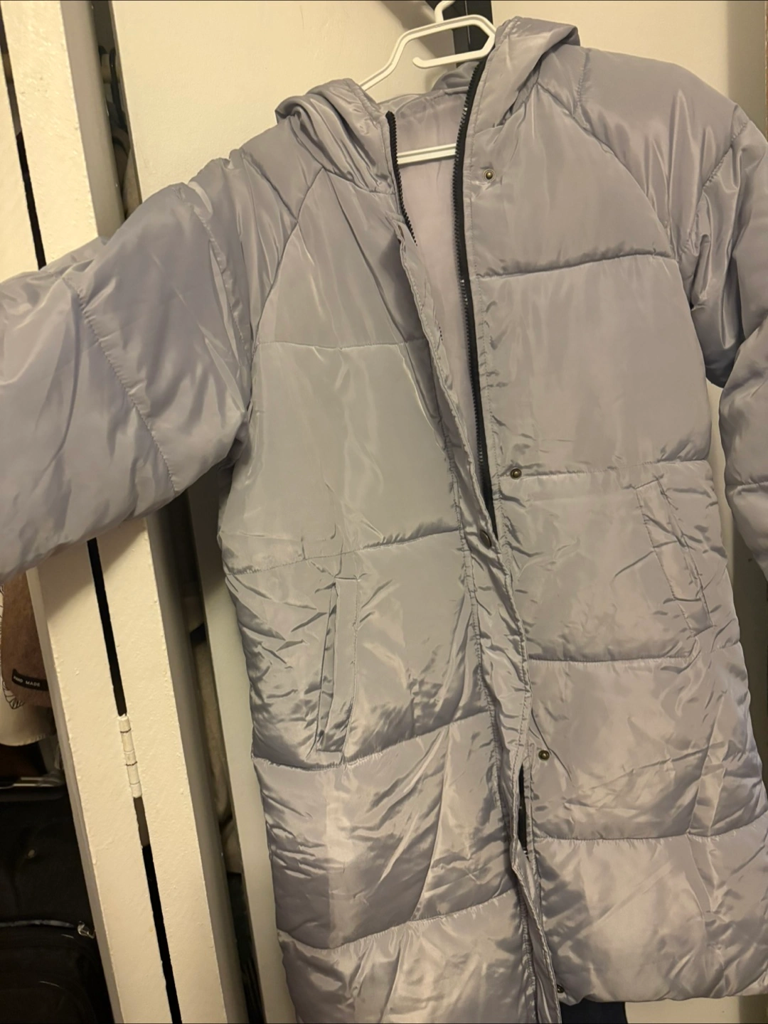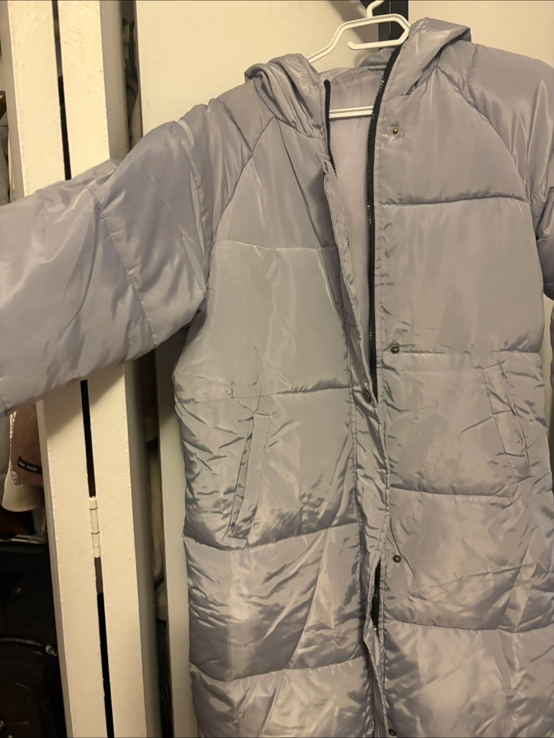 Selling a cozy grey puffer coat! It's in great condition and perfect for staying warm during the colder months. It features a hood and a zipper closure