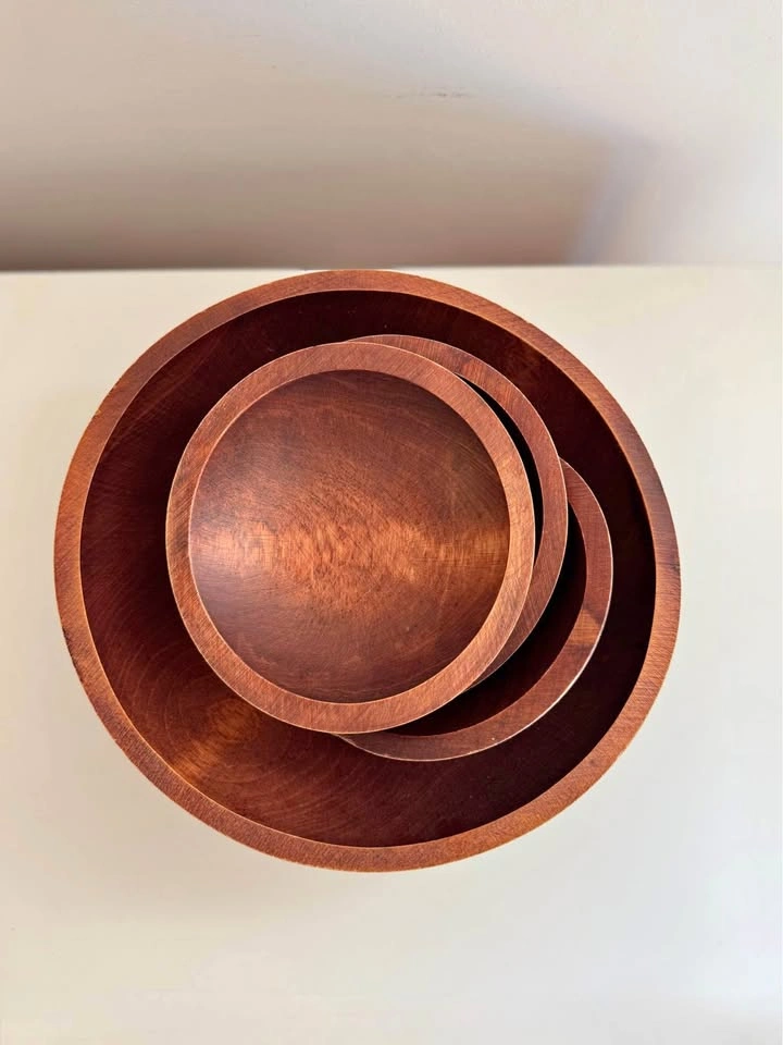 Add a touch of vintage Canadian craftsmanship to your home with this beautiful 5-piece Baribocraft wood bowl set. Perfect for serving salads, fruit, or as a decorative centerpiece. This set includes one large serving bowl and four individual bowls, all with a rich, dark "teak-look" stain.