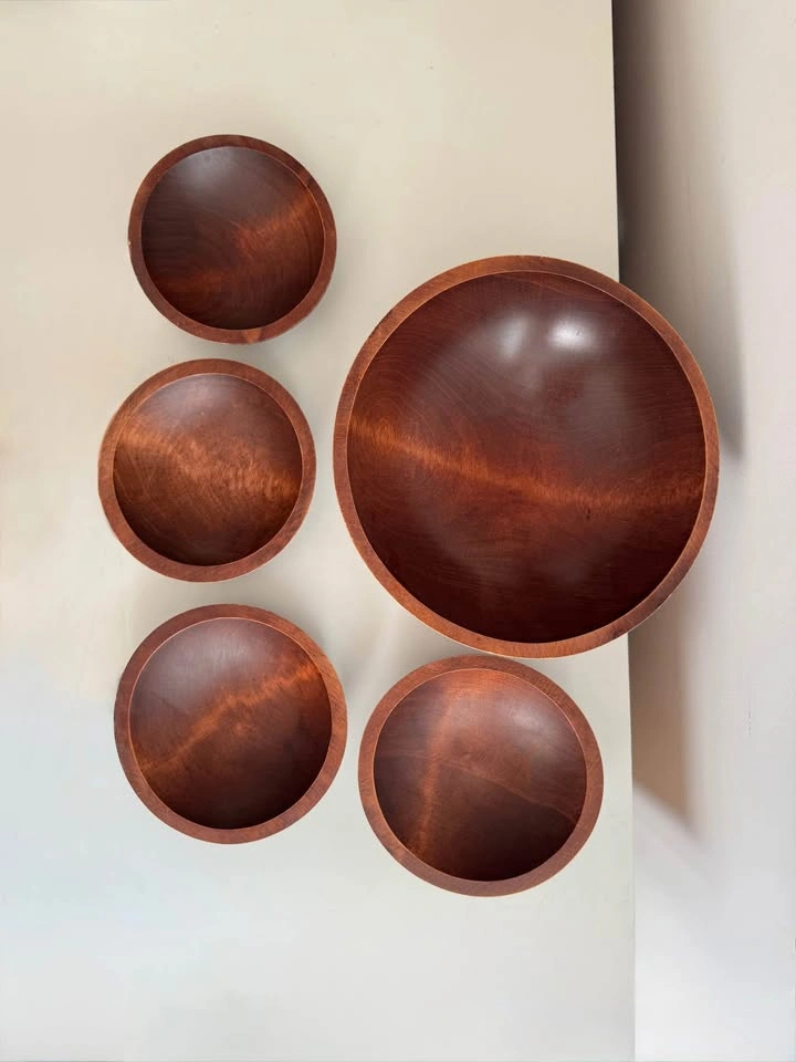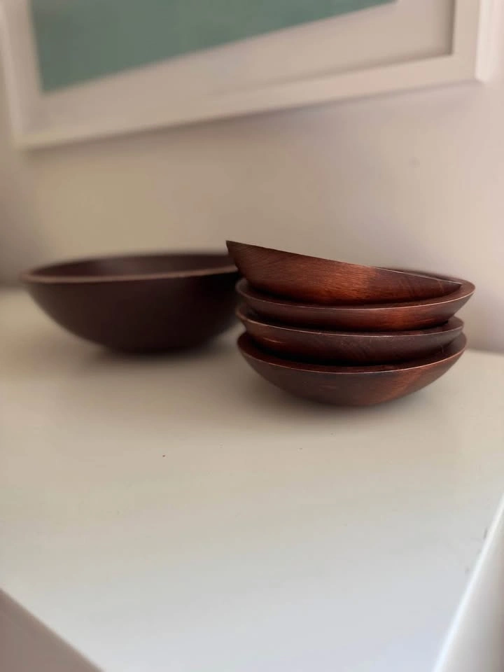 Add a touch of vintage Canadian craftsmanship to your home with this beautiful 5-piece Baribocraft wood bowl set. Perfect for serving salads, fruit, or as a decorative centerpiece. This set includes one large serving bowl and four individual bowls, all with a rich, dark "teak-look" stain.