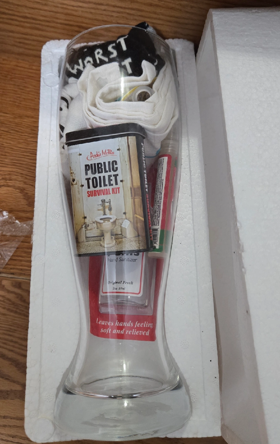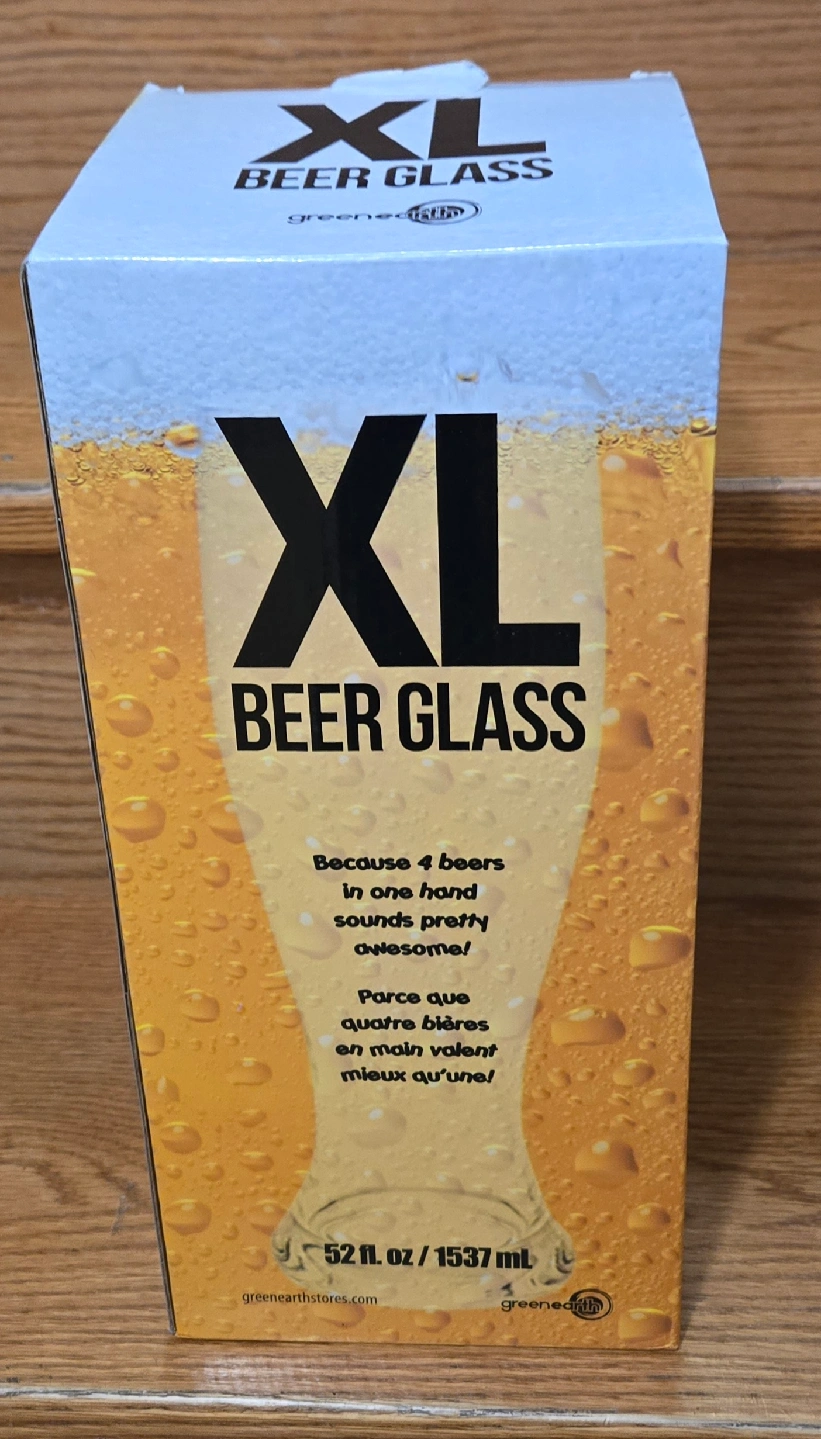 Selling a Greenedition XL Beer Glass that holds 52 fl oz / 1537 ml. It comes with a Public Toilet Survival Kit inside. This is a fun gift for anyone who likes beer and a bit of humour!