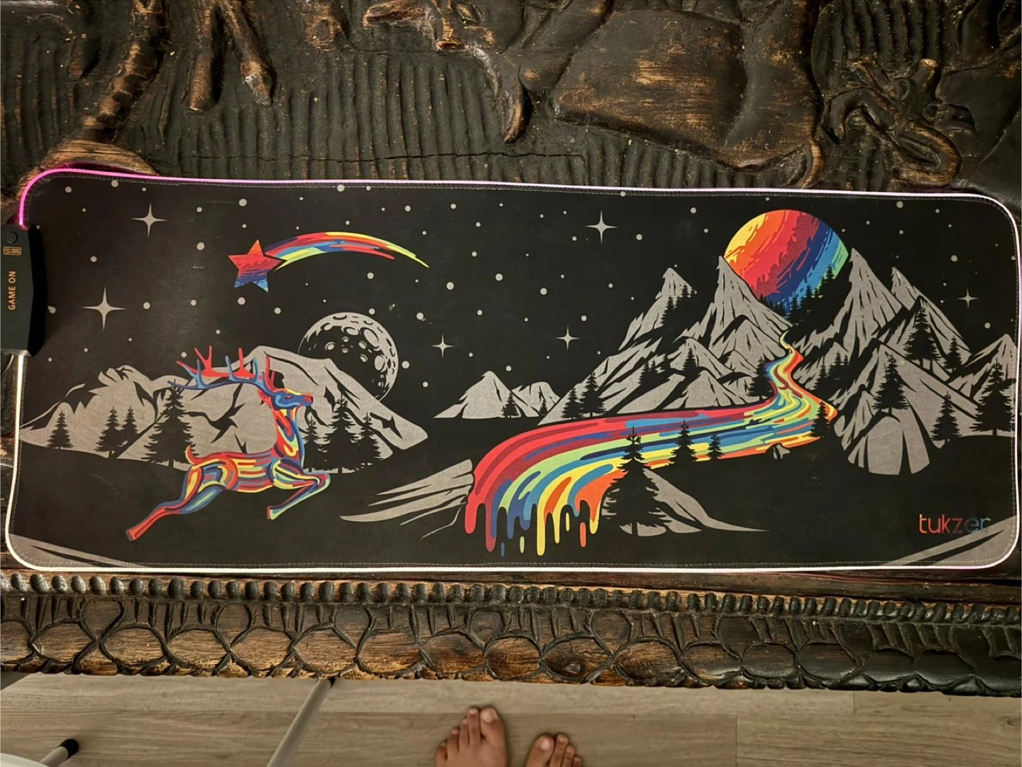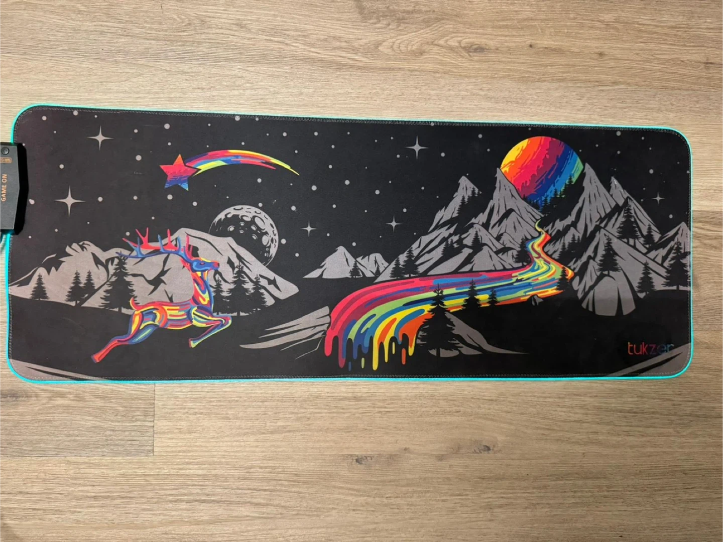 Here's a RGB gaming pad! It features a unique design with a colourful deer and mountain scene, and has customizable lighting effects to enhance your gaming setup. The pad also includes a USB hub for added convenience. It is non slippery.