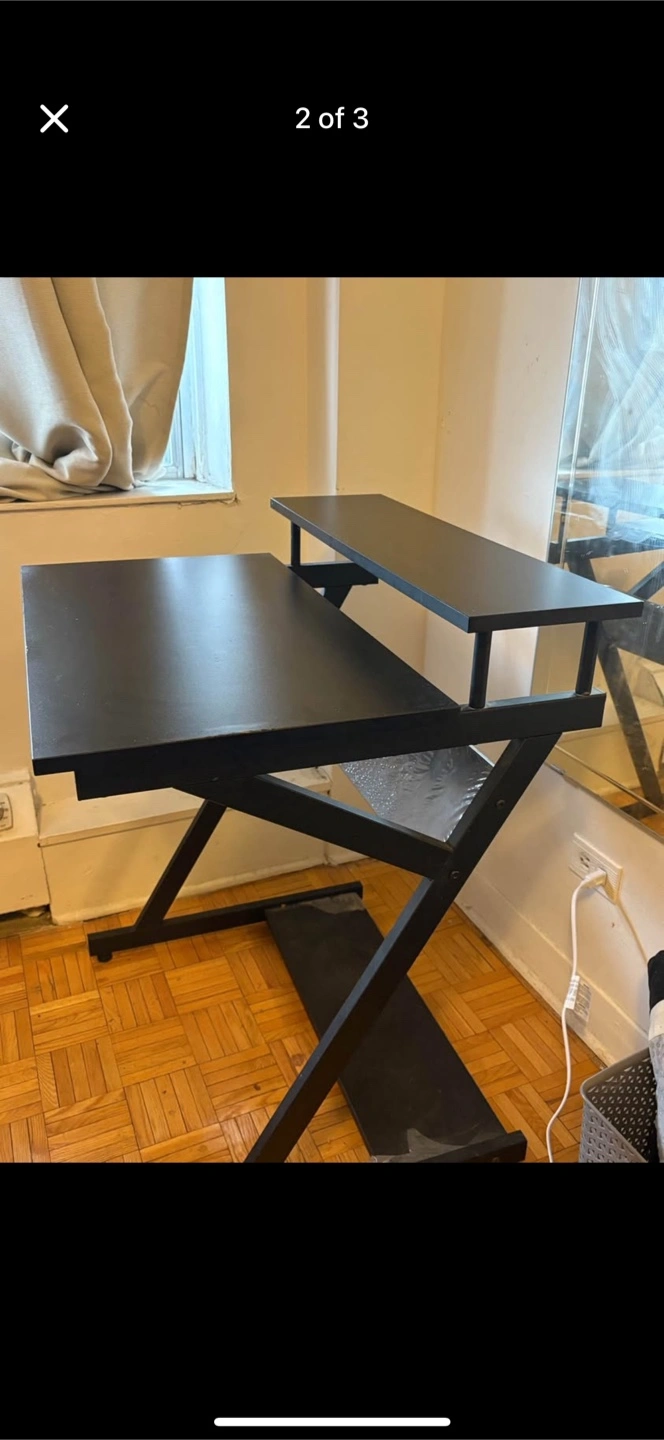 Selling a black office desk and chair set. The chair has a mesh back and adjustable armrests. The desk has a simple, modern design with a top shelf for extra storage. Perfect for a home office setup!