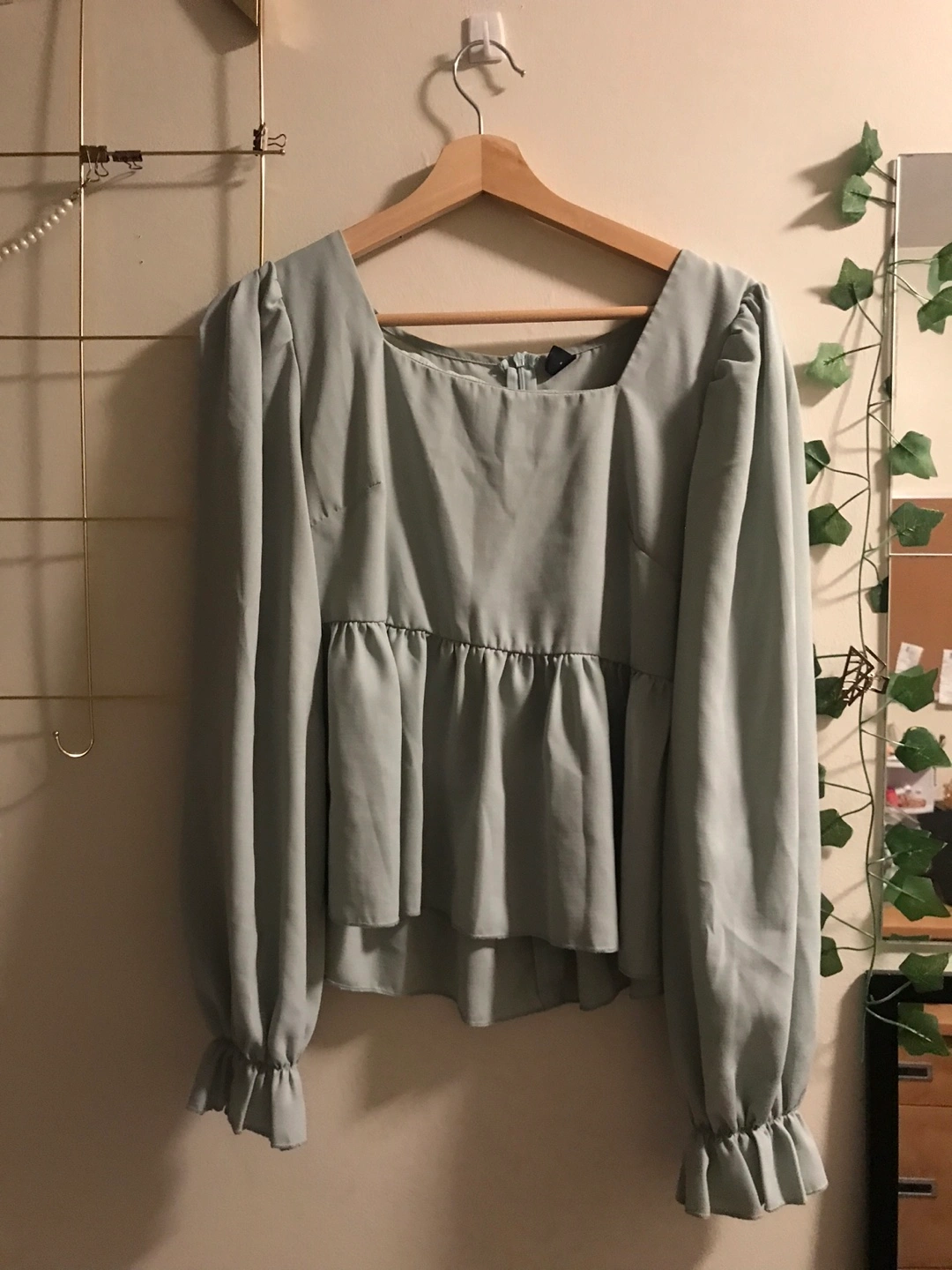 Selling a cute Shein peplum top in a lovely sage green colour! It's a size large and features a square neckline and long sleeves with ruffled cuffs. Perfect for a casual or dressed-up look!