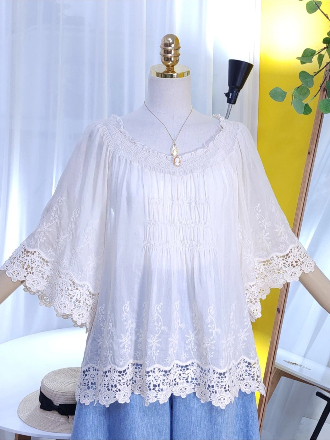 239π Description: A romantic vintage blouse featuring delicate embroidery and intricate lace trim along the hem and sleeves. Designed with an elastic neckline, it can be styled as an off-shoulder top for a bohemian look or worn traditionally. Its flowy fit and breathable cotton-silk blend make it perfect for spring and summer outfits, music festivals, or casual layering with denim and skirts. β Material: β’ Body: 70% Cotton, 30% Silk β’ Lace parts: 100% Cotton β Size: Flat Measurements β’ Bust (pit to pit): 51 cm (20.1β) β’ Total Length: 66 cm (26β) β’ Tagged size: 9 (Japan sizing) β’ Recommended size: Fits closer to SβM for Women depending on desired fit. Please refer to detailed measurements for best fit. β Features: β’ Elastic neckline (wearable on or off-shoulder) β’ Embroidered floral pattern throughout β’ Crochet lace trim on hem and wide sleeves β’ Lightweight cotton-silk blend fabric with soft drape π Condition: β’ Overall in excellent vintage or secondhand condition. Due to the nature of items, there may be minor signs of wear, such as slight stains or small imperfections.