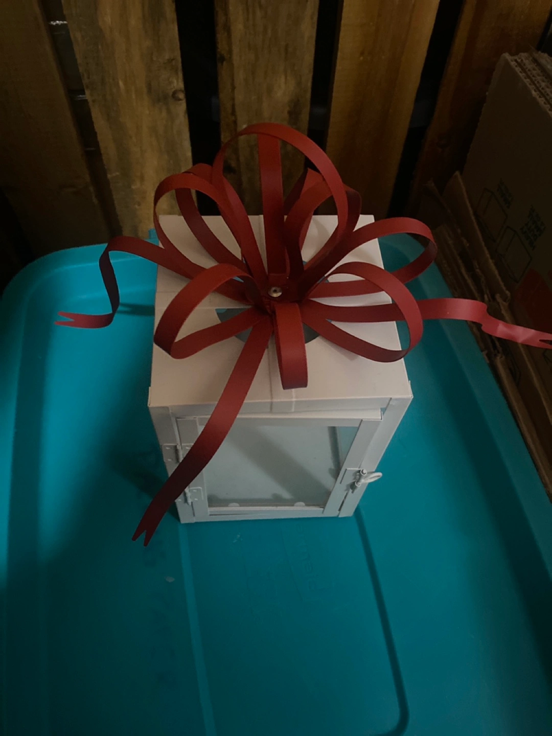 White Metal Lantern with Red Ribbon