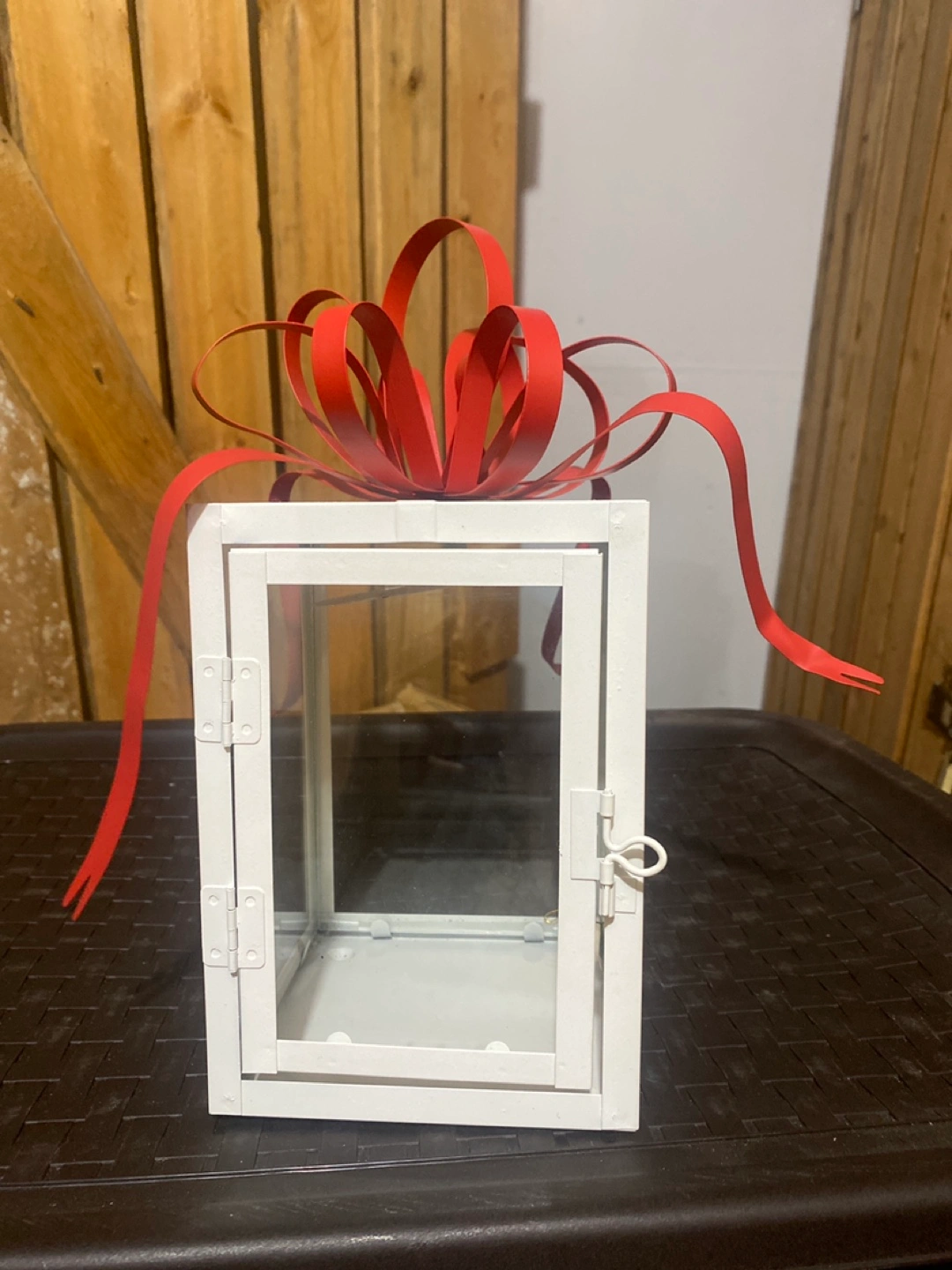 Selling a charming white metal lantern, perfect for adding a touch of warmth to any room! It comes adorned with a festive red ribbon, making it a delightful decorative piece