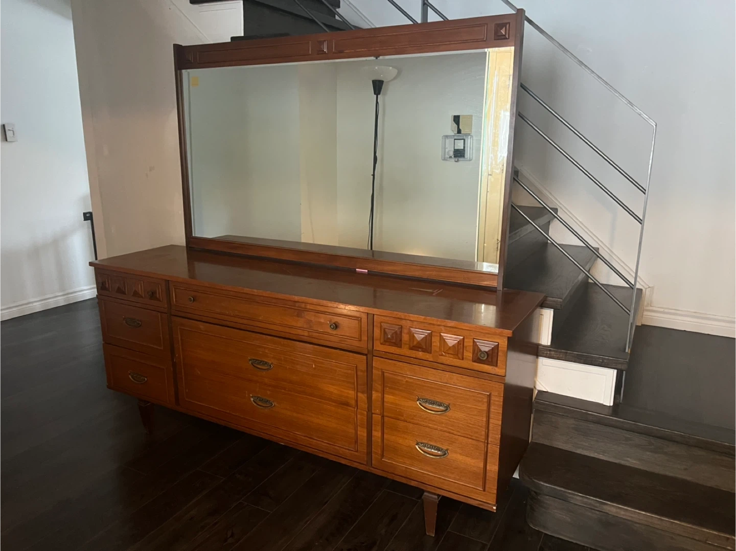 Selling a wood dresser with an attached mirror. It features multiple drawers for ample storage space. There are some scratches on the top surface.