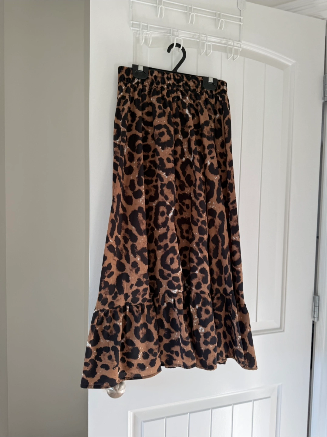 Selling two skirts! One is a cream-coloured tulle skirt with black polka dots. The other is a brown leopard print skirt with a ruffled hem. Both are in great condition and ready for a new home